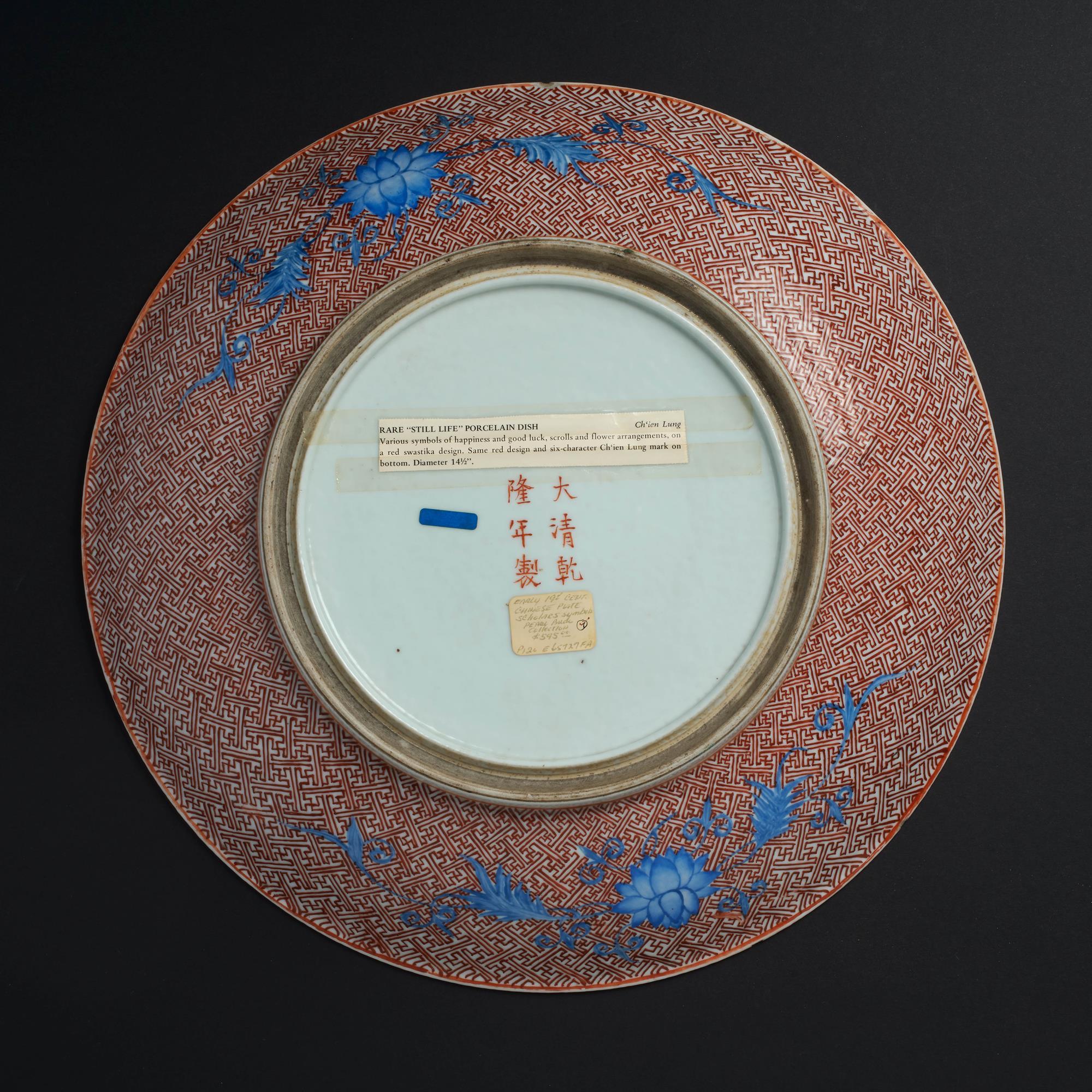 An unusual "Famille–rose" porcelain charger, decorated with precious objects against a red diaper ground. Apocryphal six-character Qianlong mark in iron red.