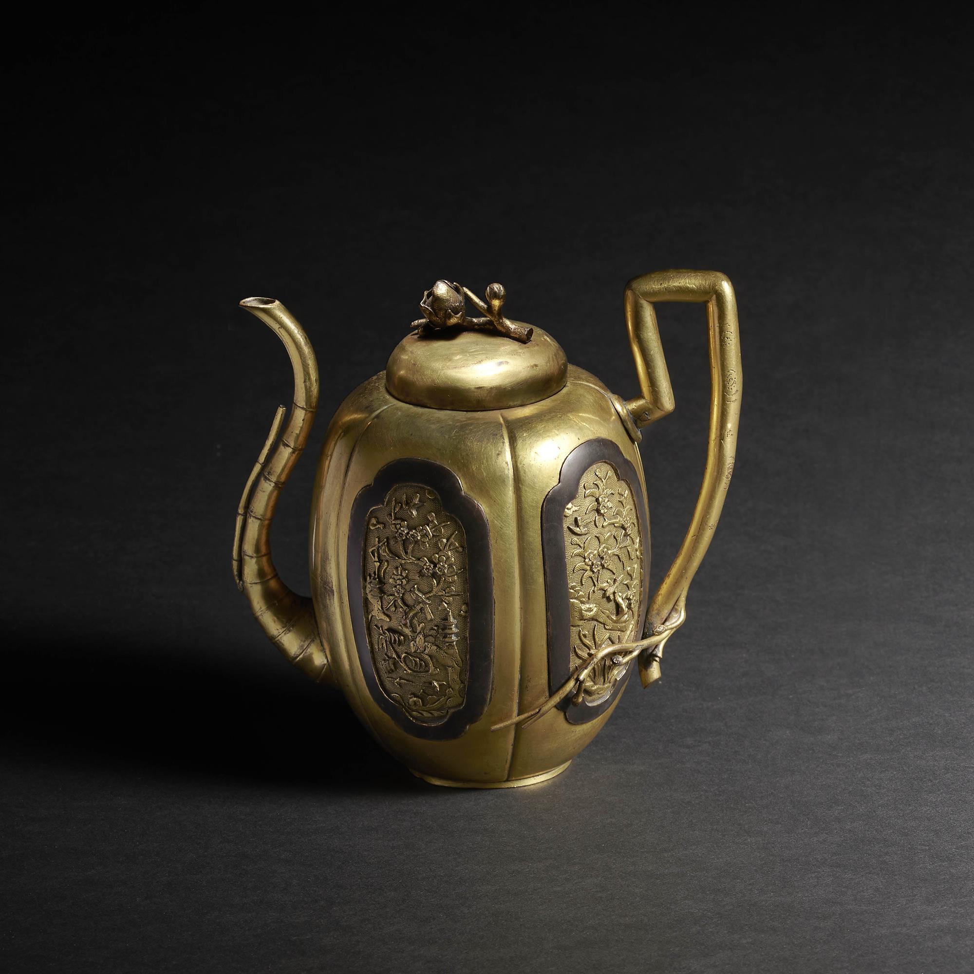 A rare gilt metal wine ewer of melon form, decorated in four cartouches with black lacquer surrounds, the high gilt relief panels depicting birds amongst floral sprays and a scholar in a boat and two ladies below a pine. The spout of simulated bamboo and the handle of a branch.