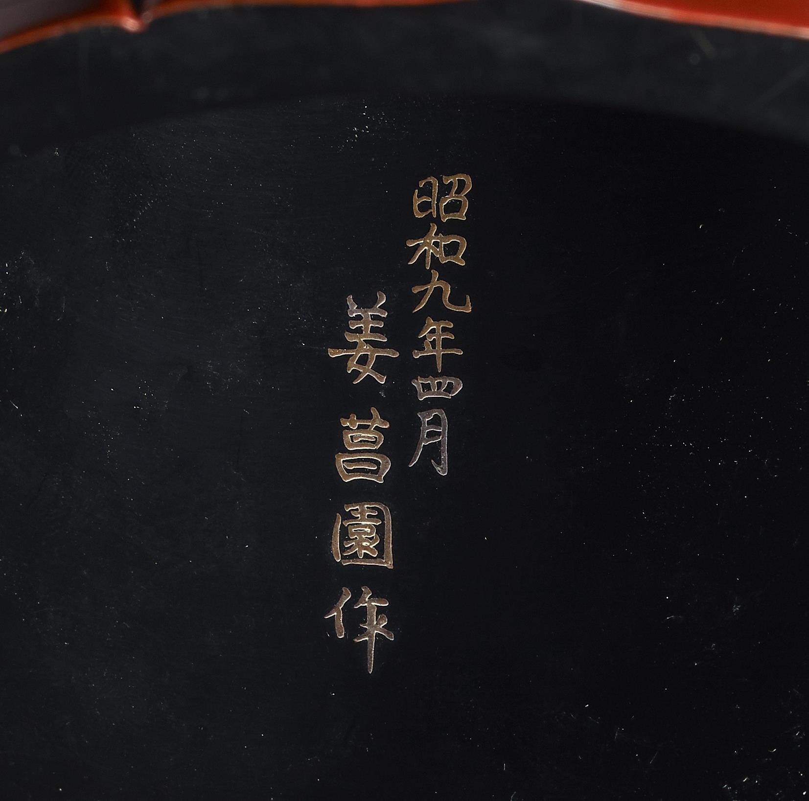 A black lacquered wood stand with an octagonal shaped rim, the circular top rising from a fluted body, the rims in red lacquer are decorated to the interior with gilt floral designs with auspicious gold double bats. The underside with a two-line gilt inscription: Showa Kyumen, Shigatsu, KANG Changwon saku (translation: Made in April 1934 by Kang Changwon).