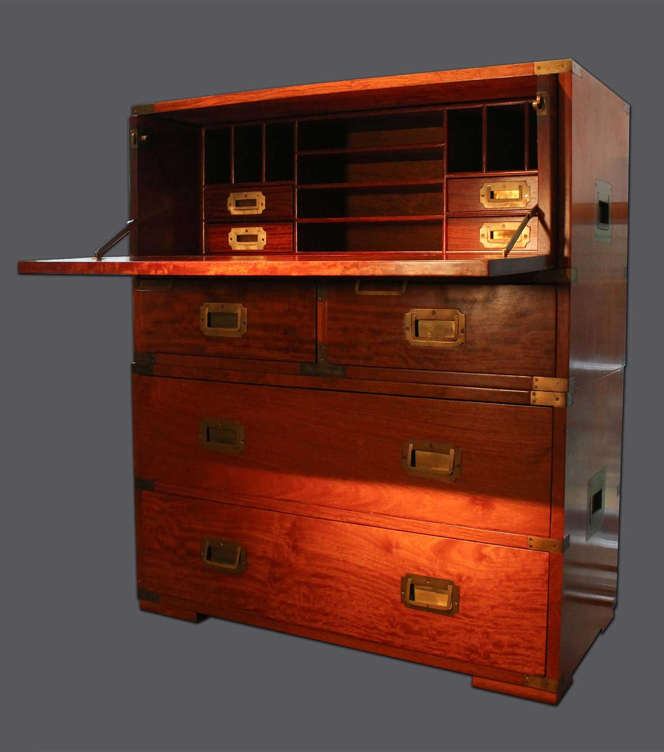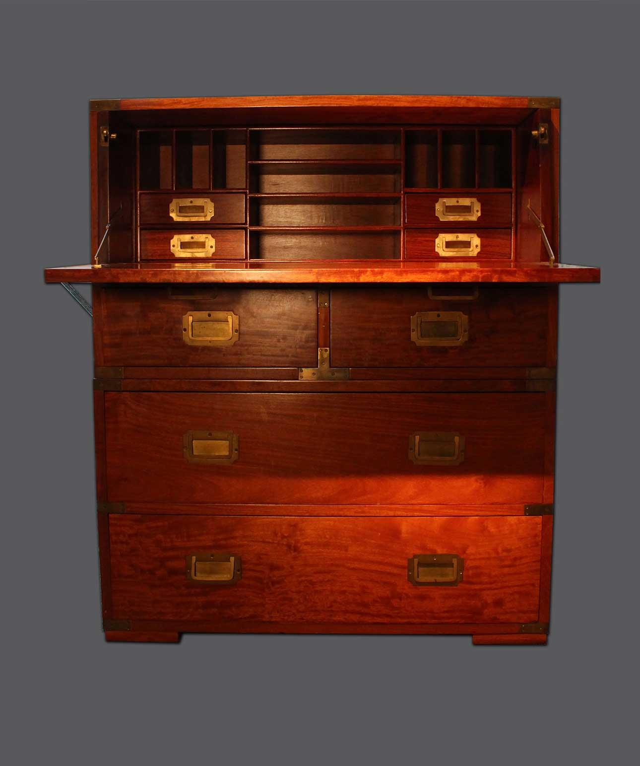 A good quality Chinese Export, chest on chest. The fall front drawer opens to reveal a secretaire. The chest in well figured solid Padauk, including all drawer linings, fitted with flush drawer and side handles, with further brass fitting to all corners.