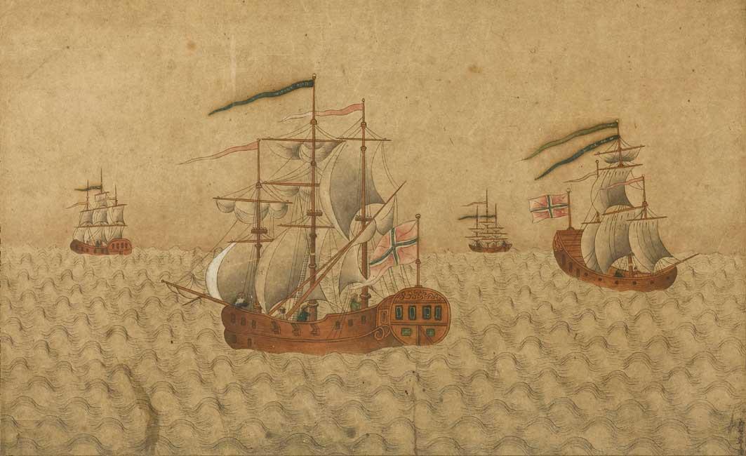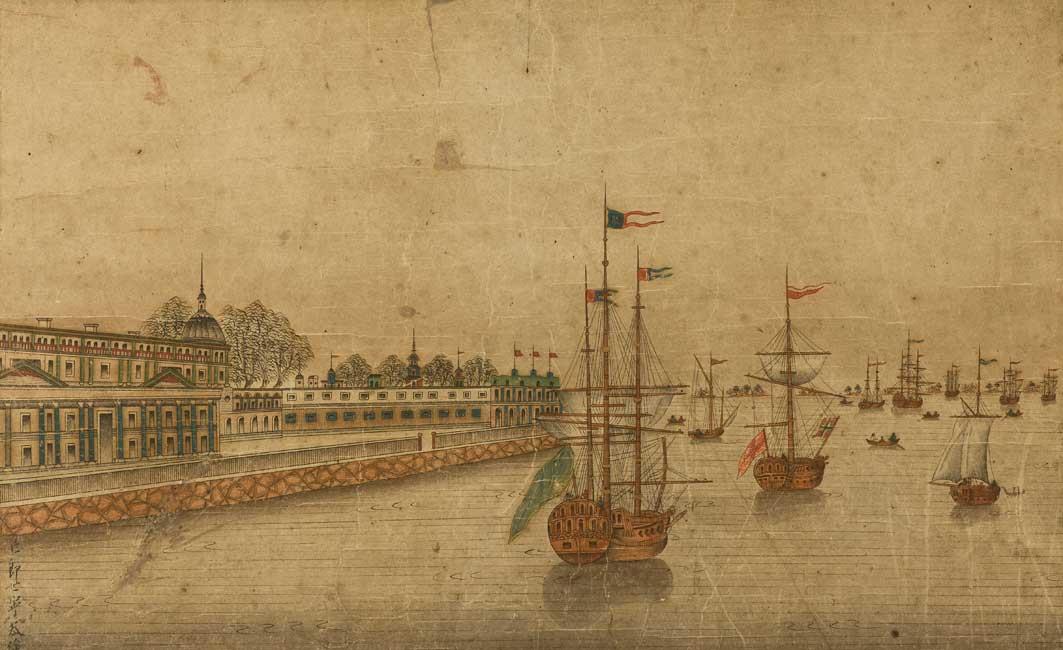 A rare pair of watercolours on paper. The first, depicting an East Indiamen in full sail upon a stylised waved sea. The second, a view of shipping anchored at harbour, St Petersburg.
