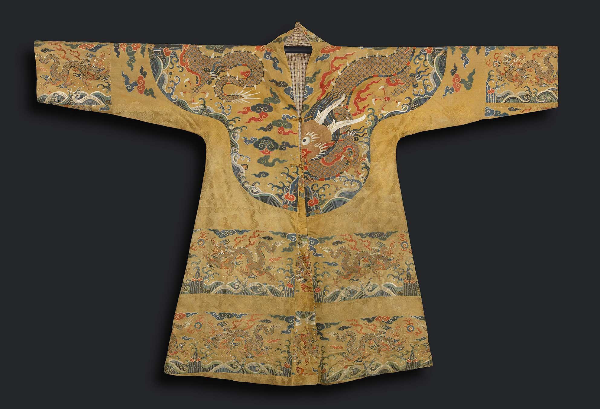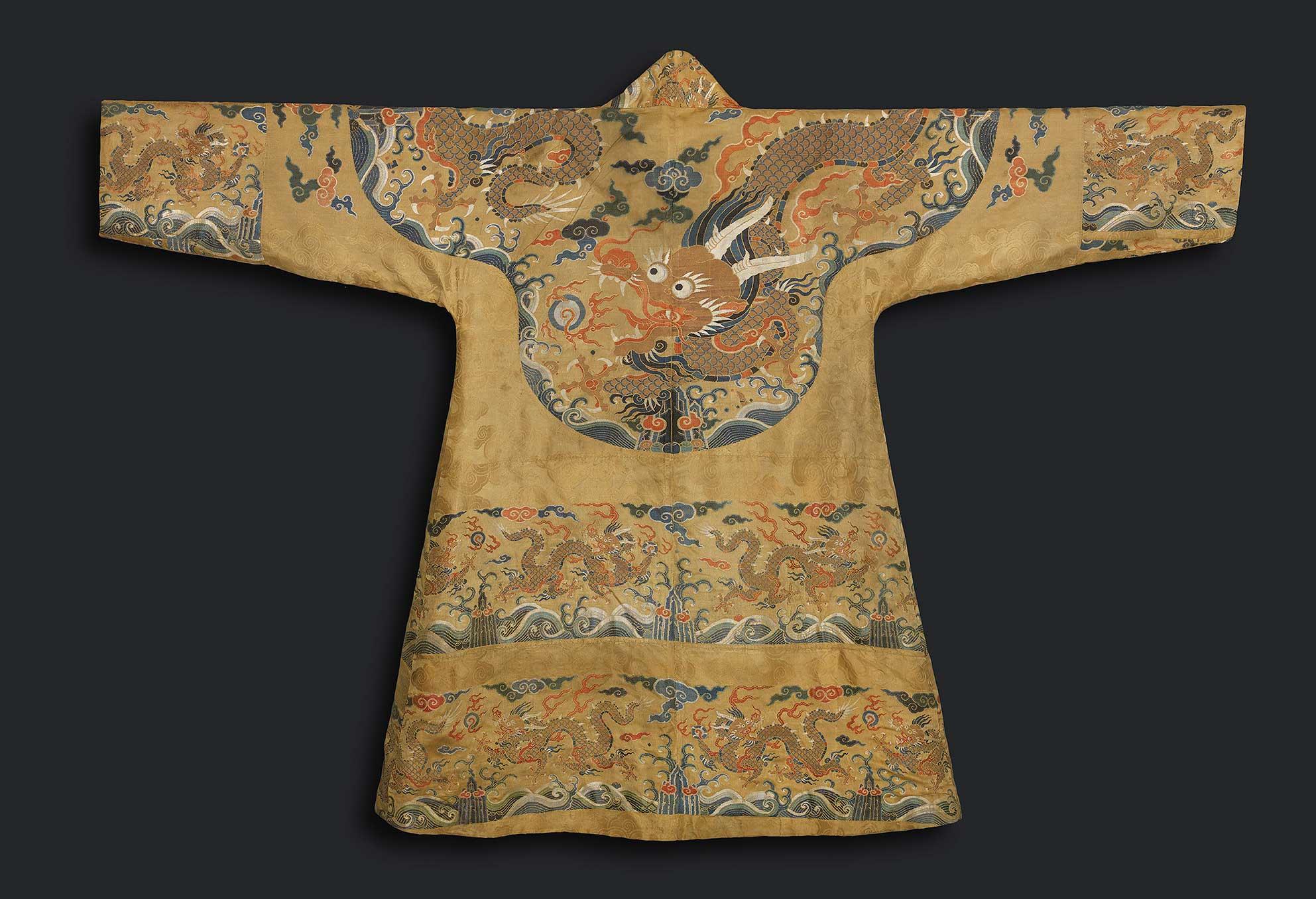 A very rare yellow satin brocade Tibetan Chuba made from the yardage of an Emperor's Chaopao. The front-opening chuba tailored in Tibet from early 18th century imperial yellow silk brocade used for an Imperial chaopao and woven in gold and multicolour threads with a quadrilobed 'collar' enclosing four full-face five-clawed gold dragons leaping around a flaming pearl amidst clouds above wind-tossed waves.