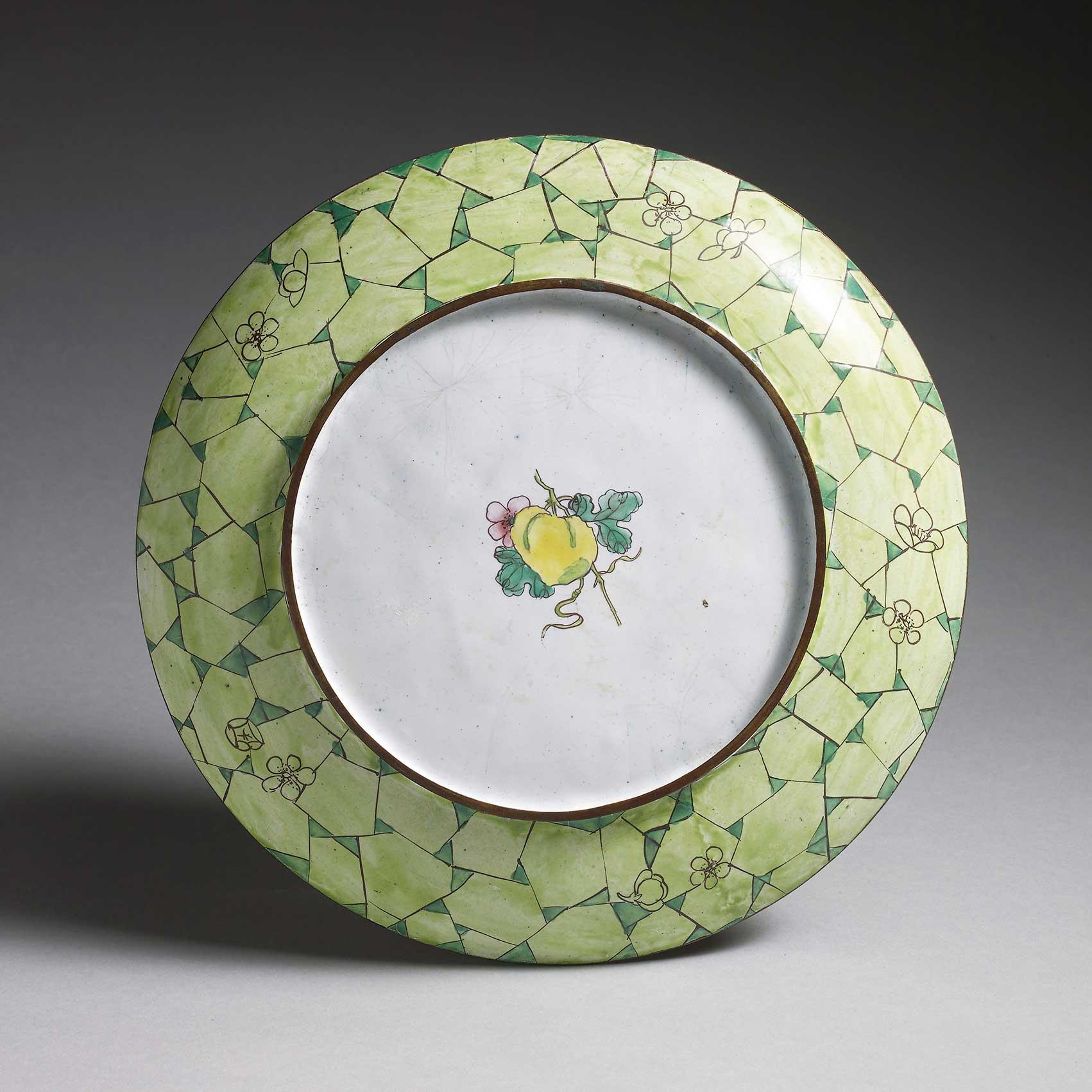 Well decorated with a golden pheasant perched on a rock surrounded by magnolia and roses. The green and yellow boarder with continuous floral design and three small cartouches with peonies and roses. The reverse painted in a green cracked ice design and marked with a yellow pumpkin.