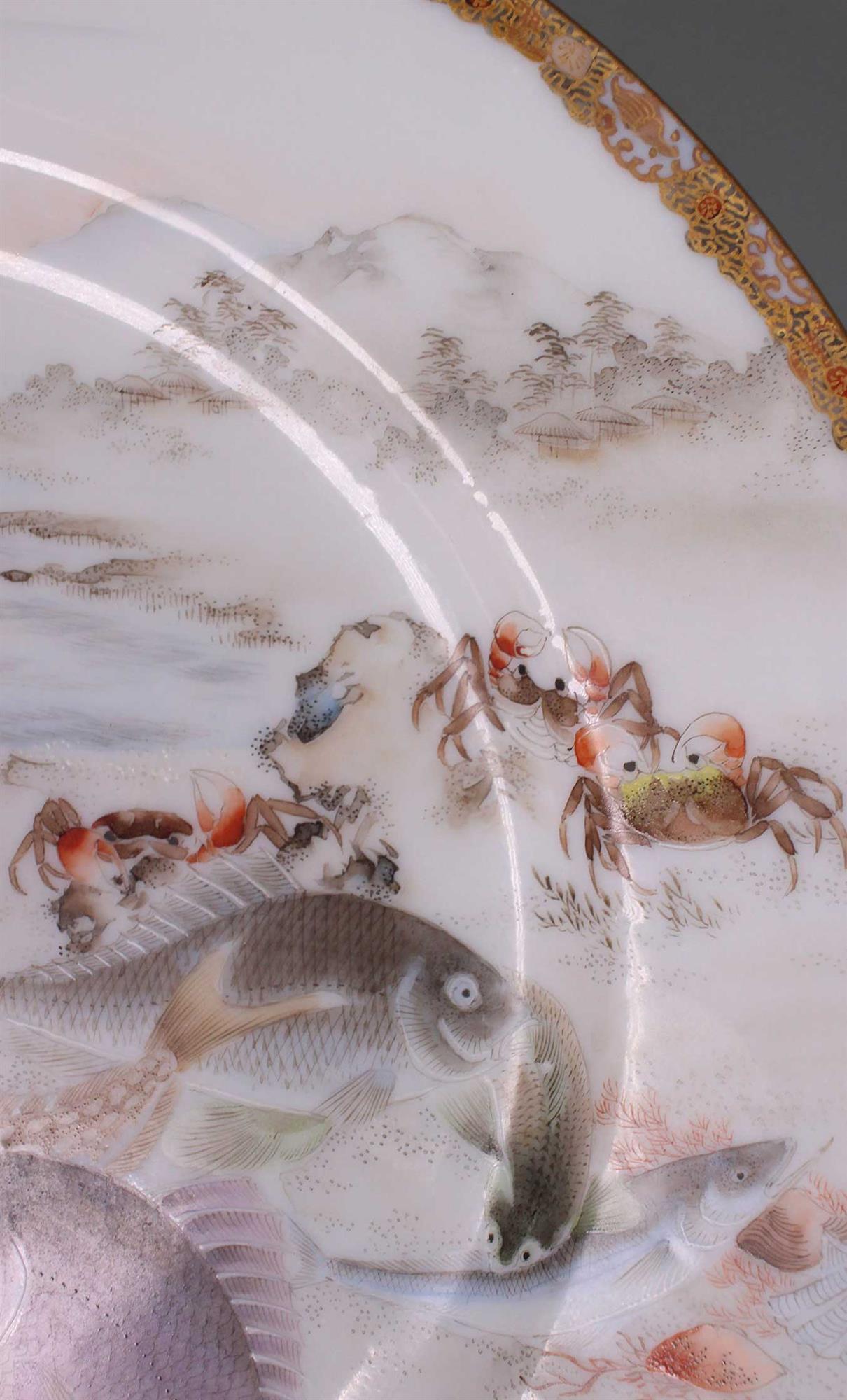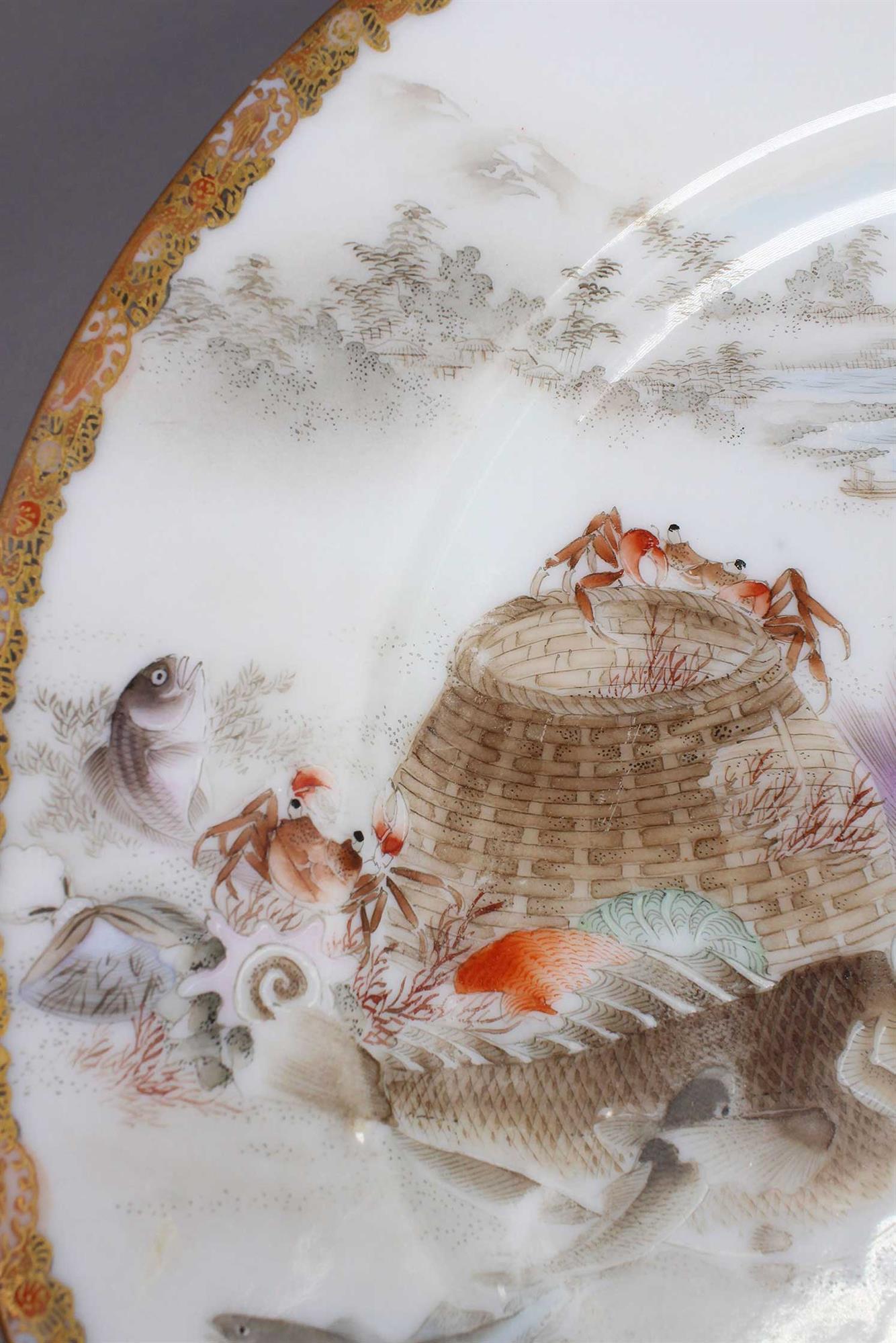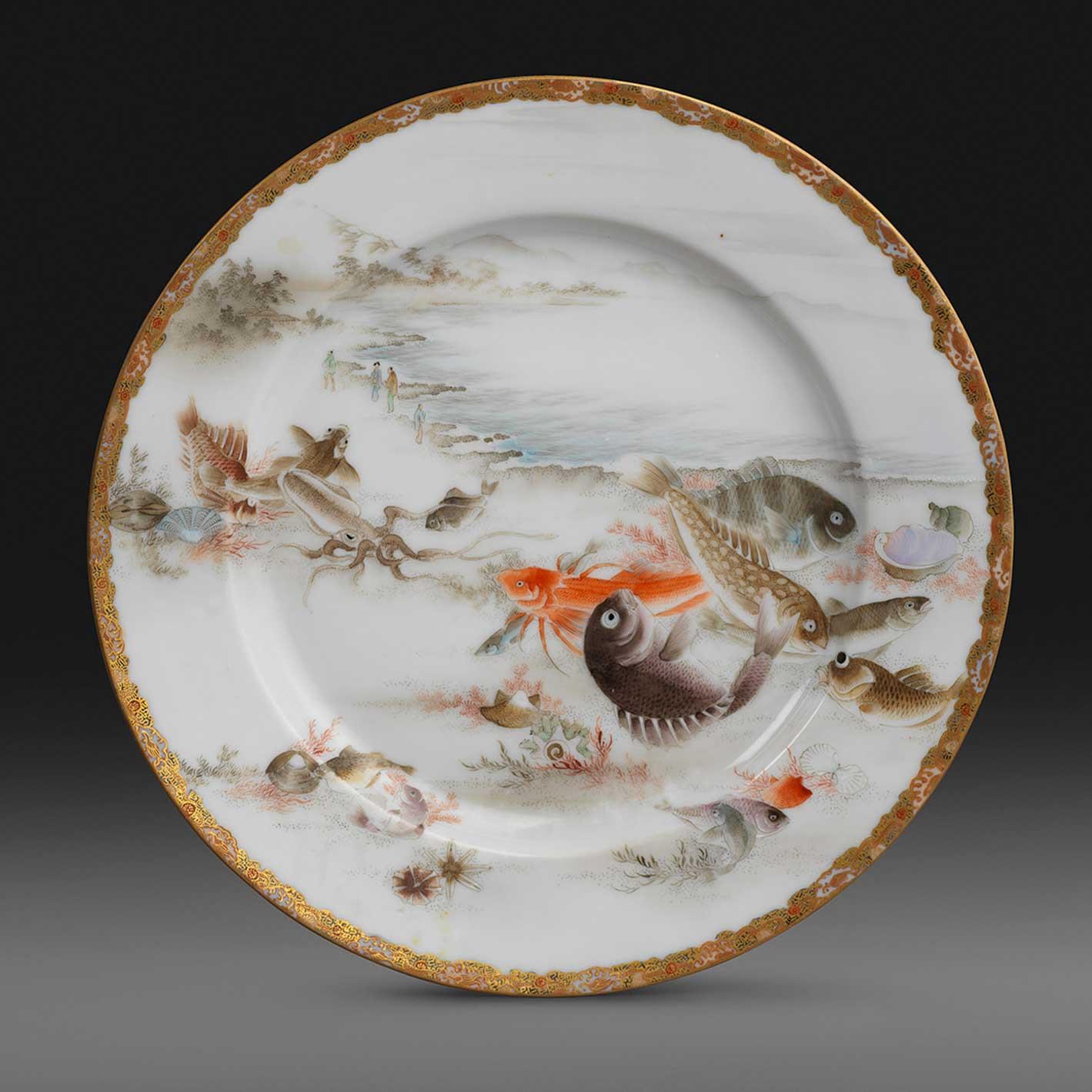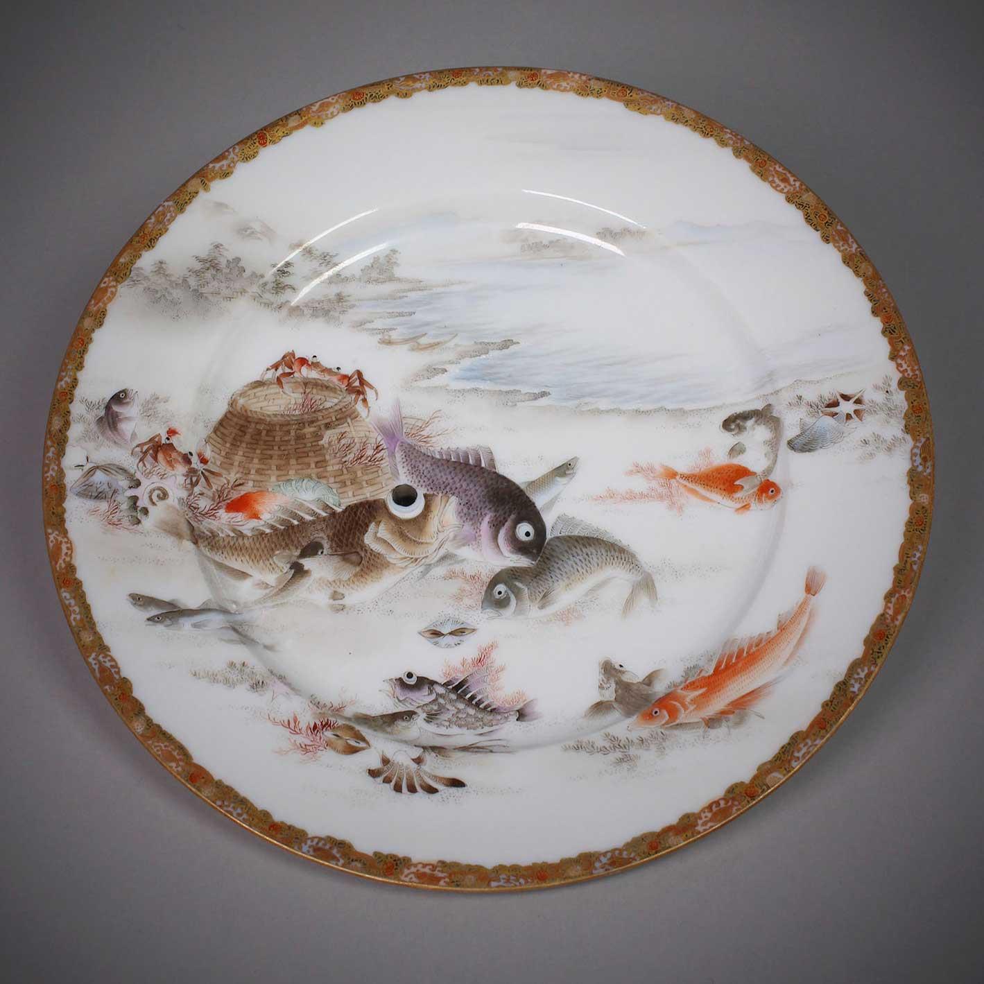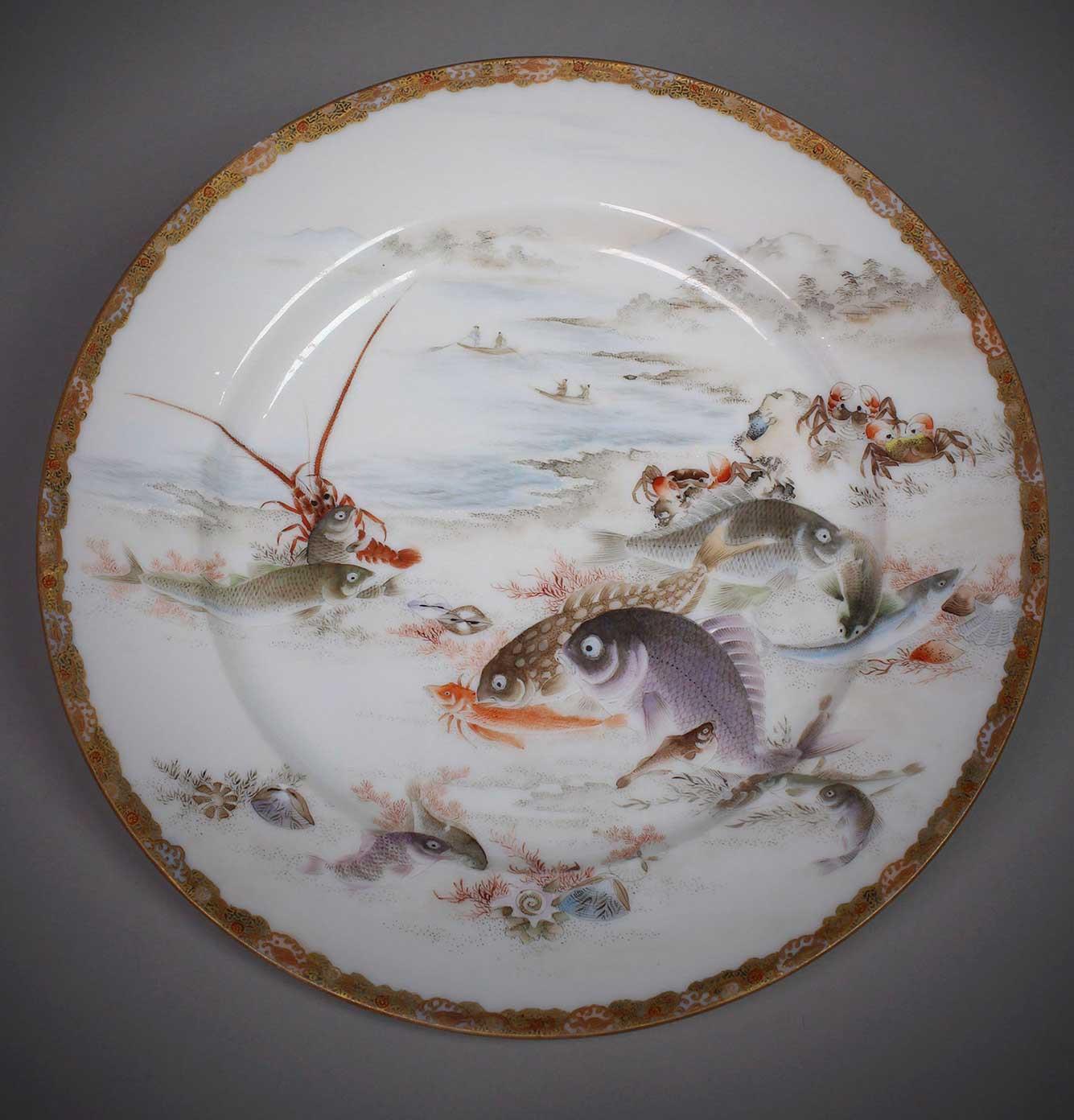 14 dining plates (not all illustrated) and one large fish platter, all exquisitely painted in natural colours with a plethora of Pacific fish from the deep to the shallows, including large octopus, bass, salmon and further in-shore with crabs, crayfish, whelks and clams. Many of the catch escaping from woven fisherman’s baskets. The mountainous background with fisherman upon rocks. The border decorated in continuous gilt designs.