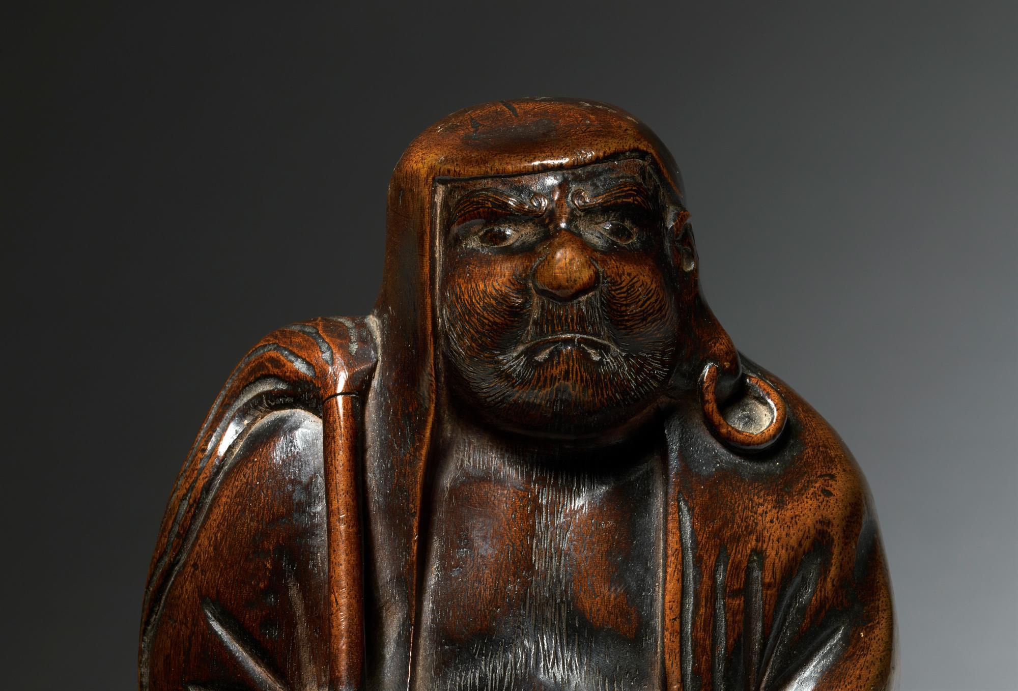 A good keyaki wood carving of a standing Daruma, with a lovely, rich patina. He has a discerning expression, large stylised eyebrows and a splendid etched beard. Holding a long fly whisk over his right shoulder, his other arm tucked into his flowing robes.