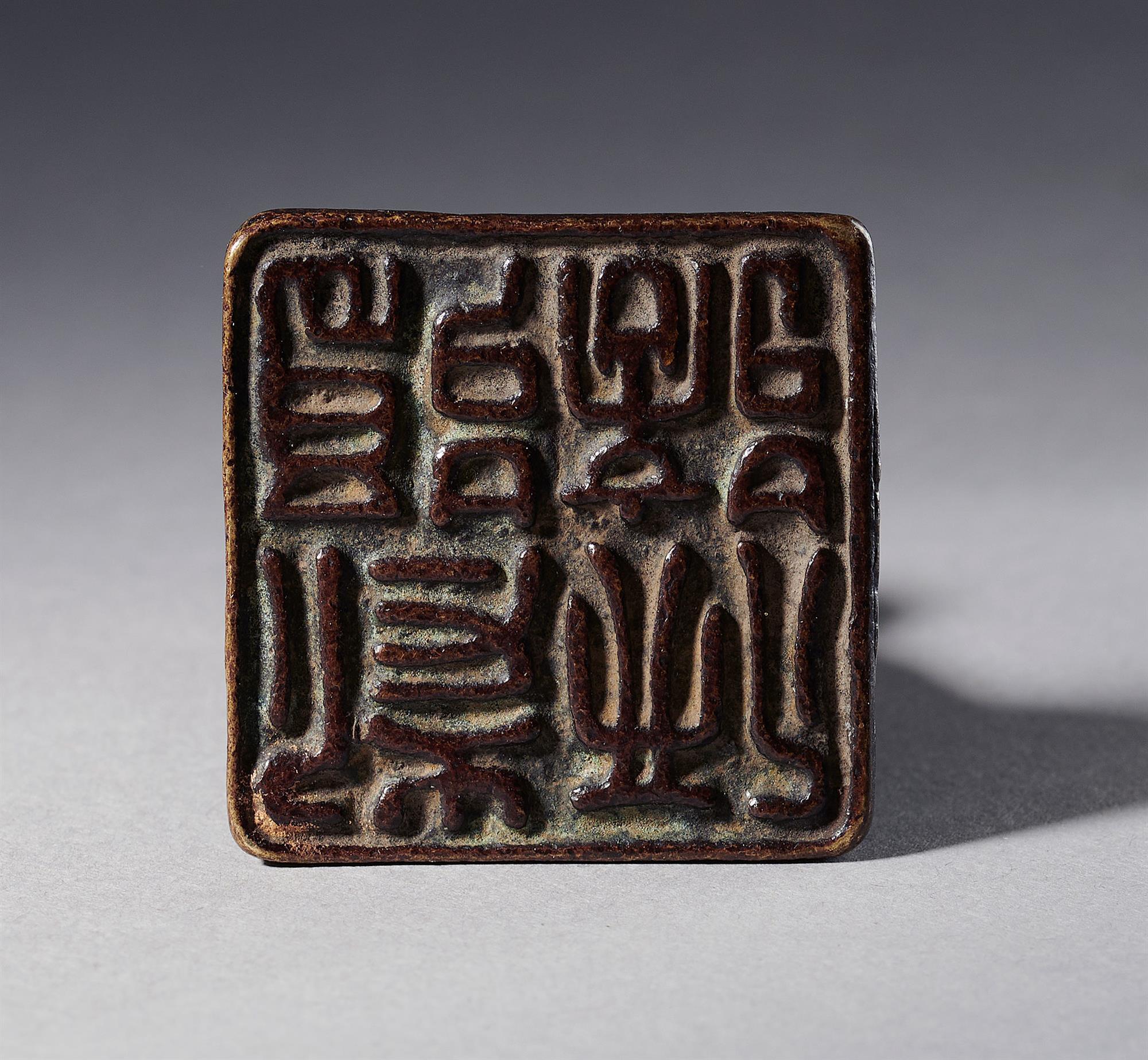 A bronze square seal surmounted by a boy holding a book. The seated figure sporting a top knot.