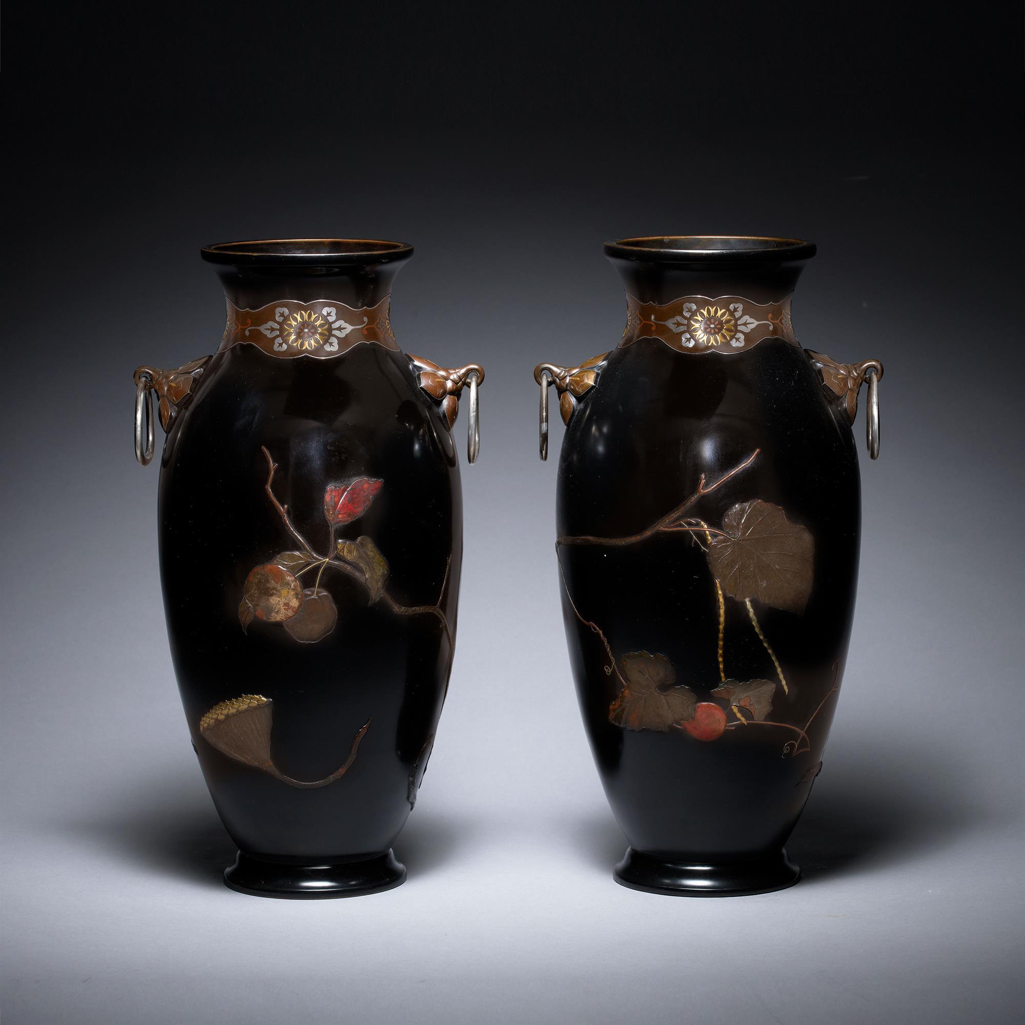 A fine pair of mixed metal bronze vases on a black patented shakudo ground, decorated with autumnal lotus with gilt seeds and ripe persimmons. The reverse with further lotus heads and entwined gourd vines with dying leaves. By Suzuki Chokichi (1848-1919) signed Kako. His work is seen in the V&A and Peabody Museum.