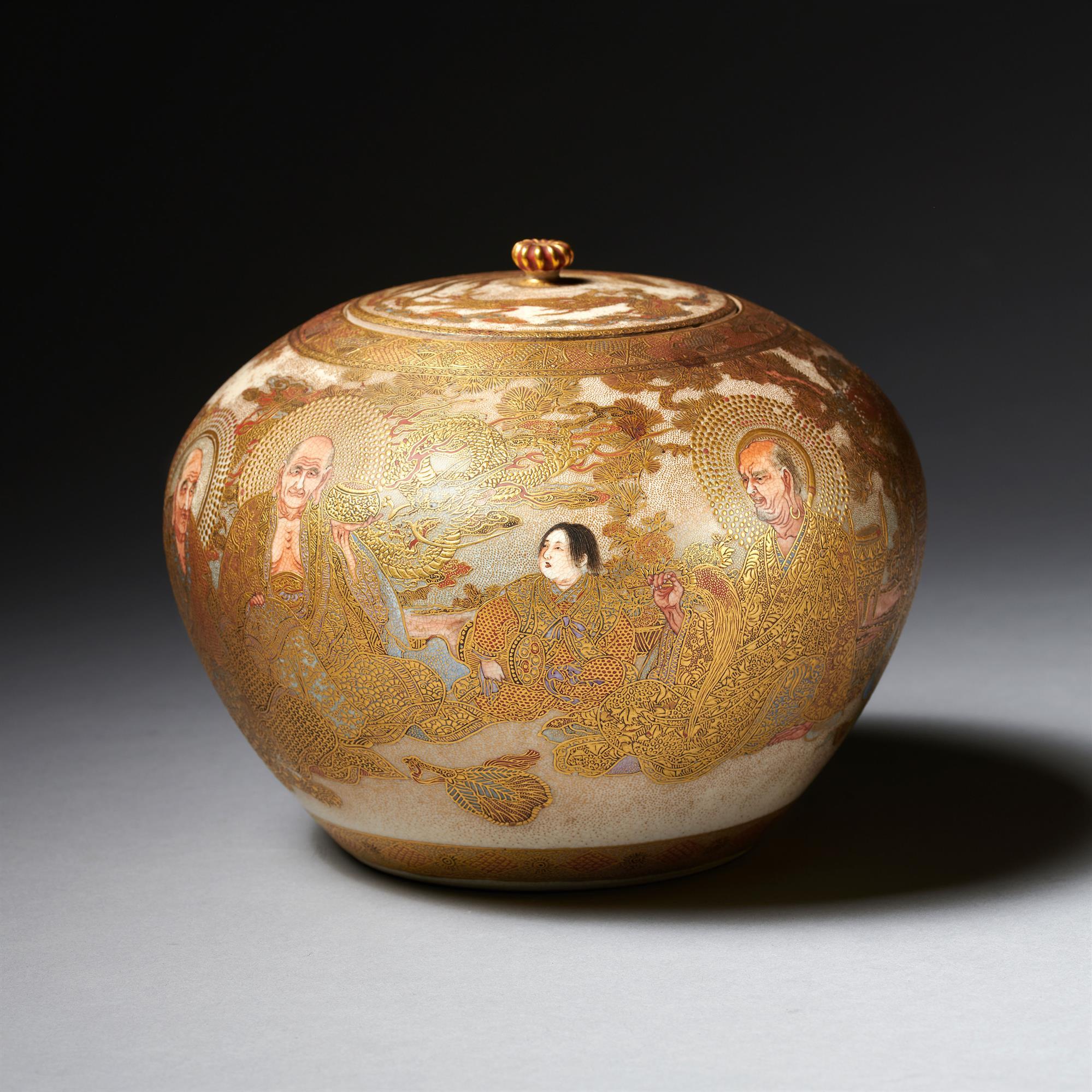 A well formed Satsuma jar and cover depicting the eight Buddhist lohan seated below a cloudy sky with flying  sea dragons, amongst other exotic precious Buddhist objects. Their robes decorated in sumptuous gold designs. One deity is seated up against a fabulous Buddhist lion. The lid decorated with a dragon and phoenix.