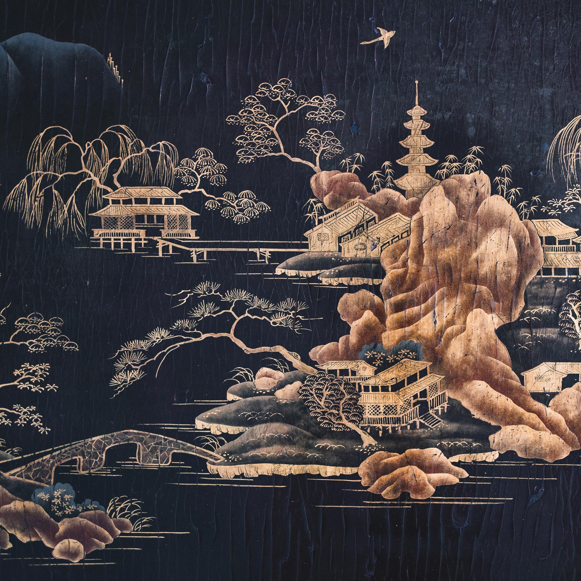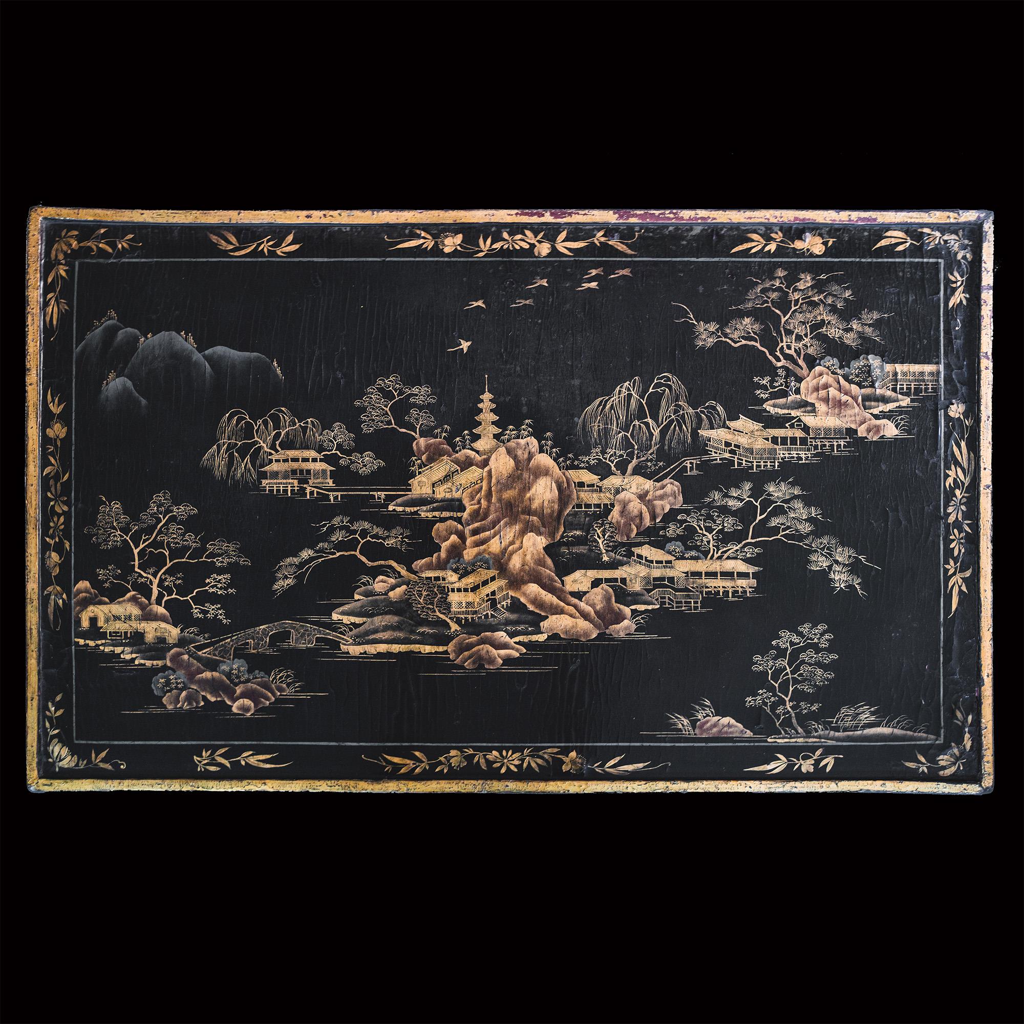 A very good example of an English style side table made in Canton for export to England. The top is decorated in gold lacquer on a black ground with exotic pavilions upon a rocky island. The fretwork and legs with further gilt lacquer decoration. (All lacquer in remarkable condition.)