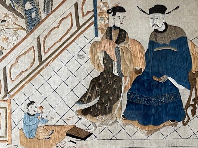 A finely embroidered silk panel depicting a noble family and servants at leisure within their garden fence.