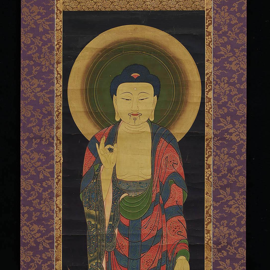 A Buddhist painting of the Amida Buddha, on a brocade mount.