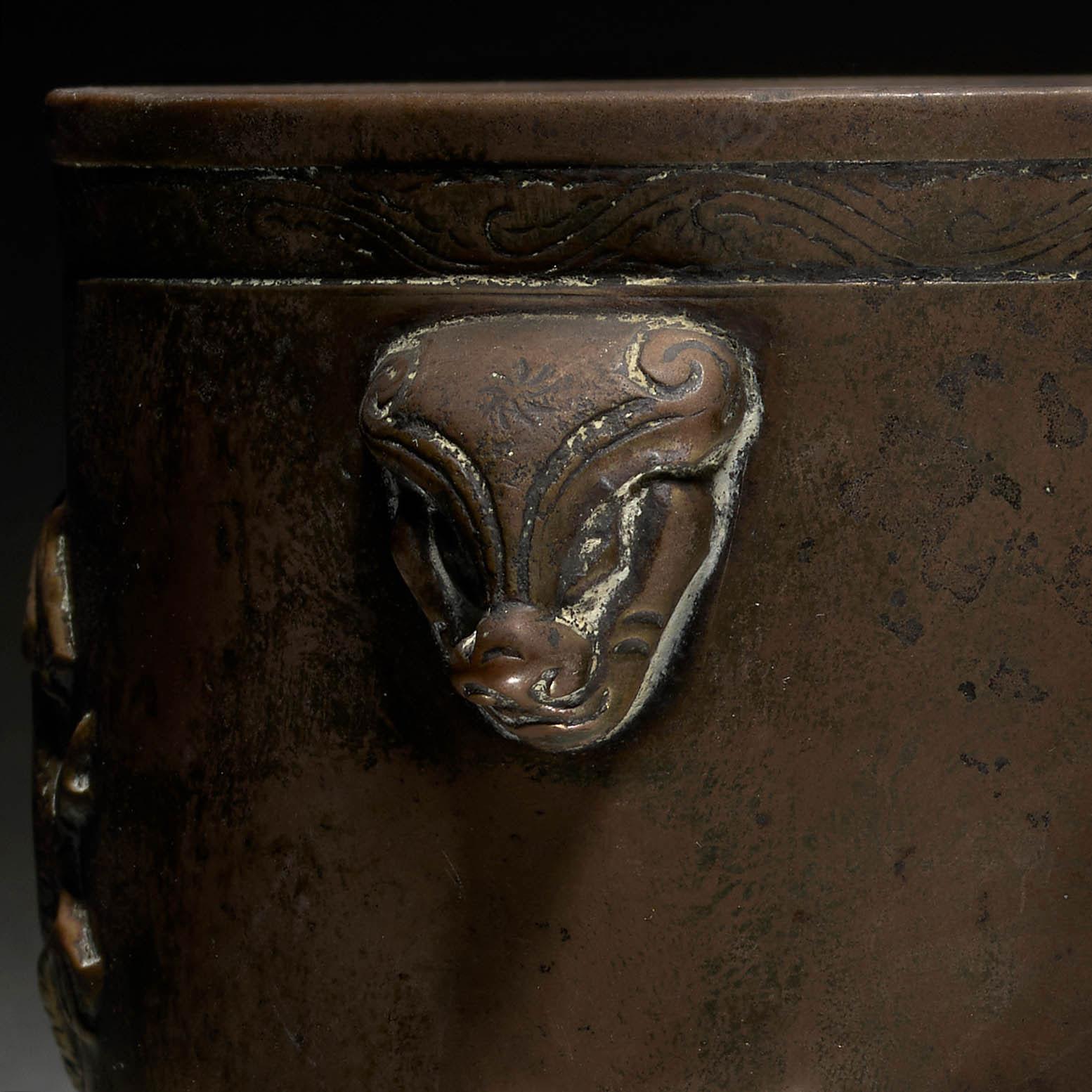 A circular bronze censor decorated with swirling dragons to either side with lion handles between an incised border. (Remnants of gilt.) China Xuande mark