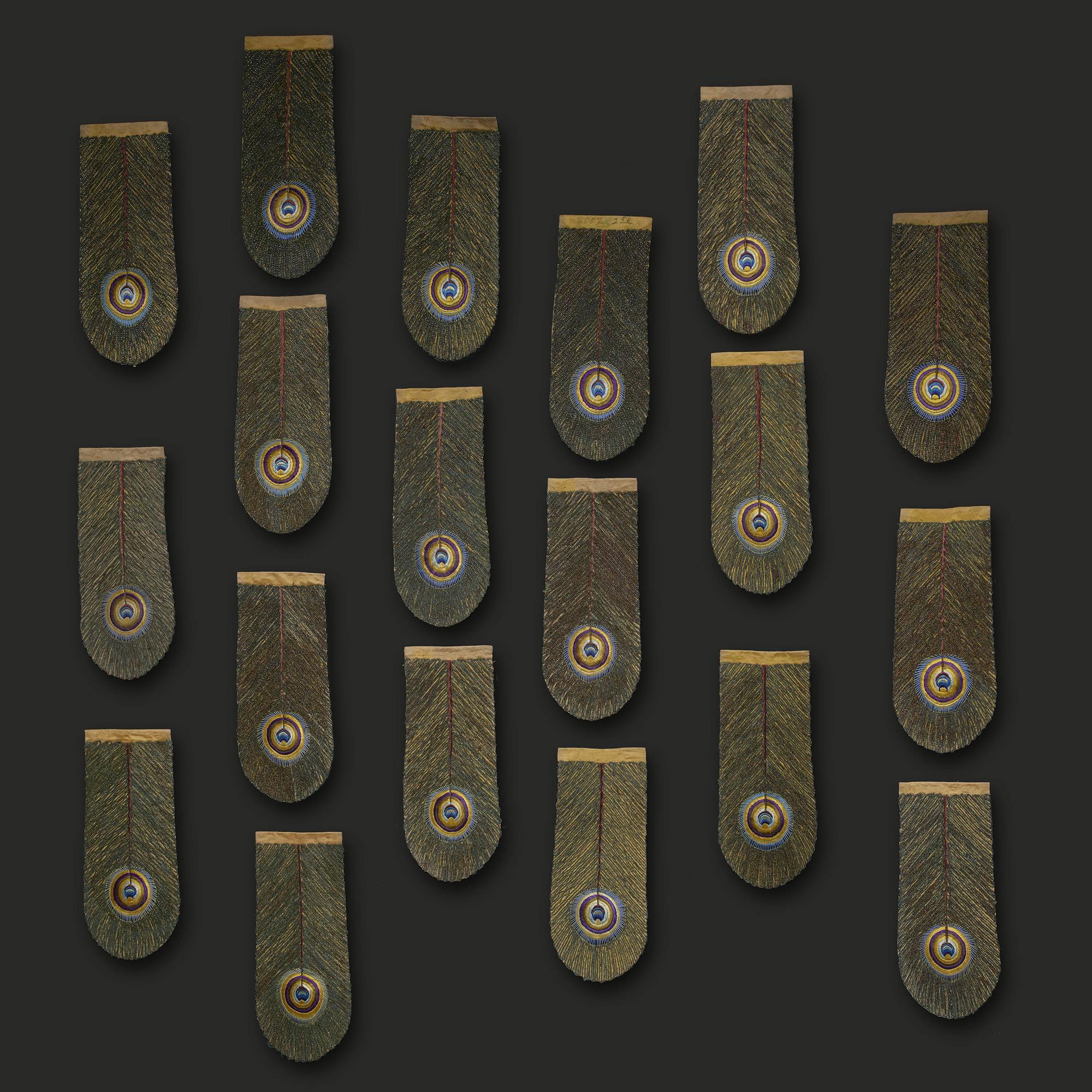 A group of nineteen lappets exquisitely worked in silk representing a peacock plume with central yellow and purple eye. The ground lavishly embroidered with peacock feather twisted threads and backed with imperial yellow lining. The shaped panels possibly used as replacements for a cape, thought to have been in the Forbidden City.