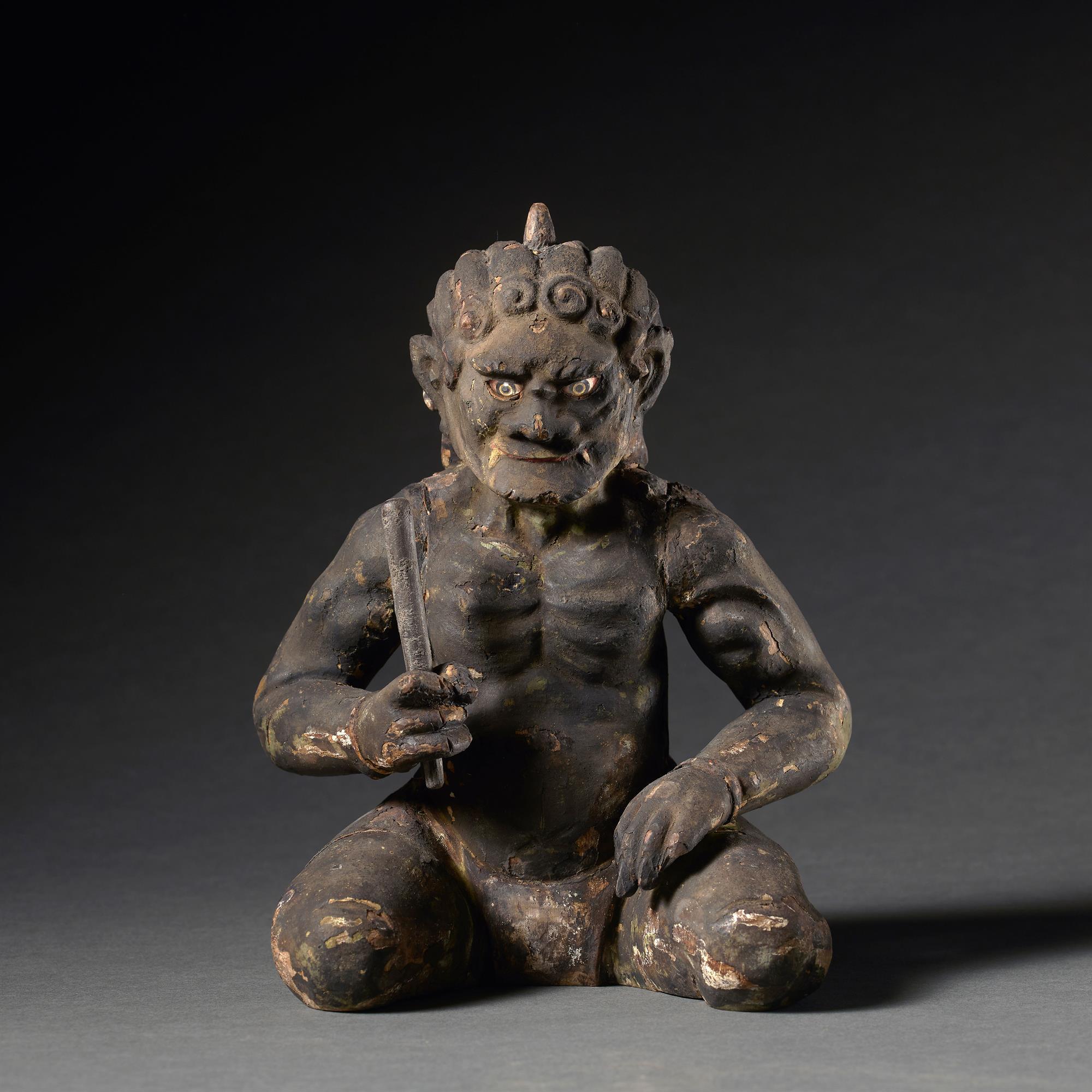 A rare, lacquered wood, carved in block form, model of a kneeling mischievous Oni with one horn and inlaid glass eyes. The overall patina is in a dark incense-stained colour. The popular demon is generally considered to be of foreign origin, although malicious and cruel they can be converted to Buddhism