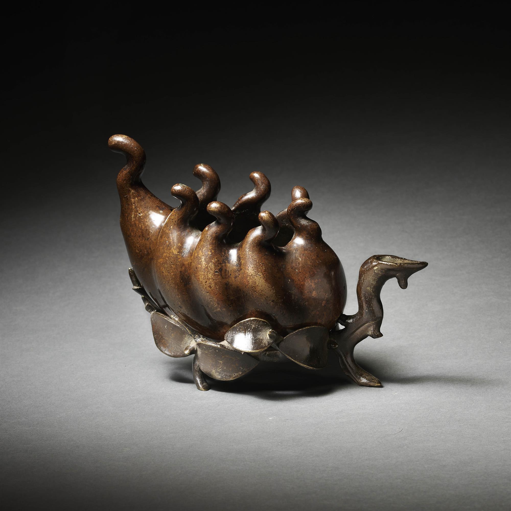 An unusual bronze incense burner in the form of a finger citron supported on a bronze branch with a rich gold splash patina.