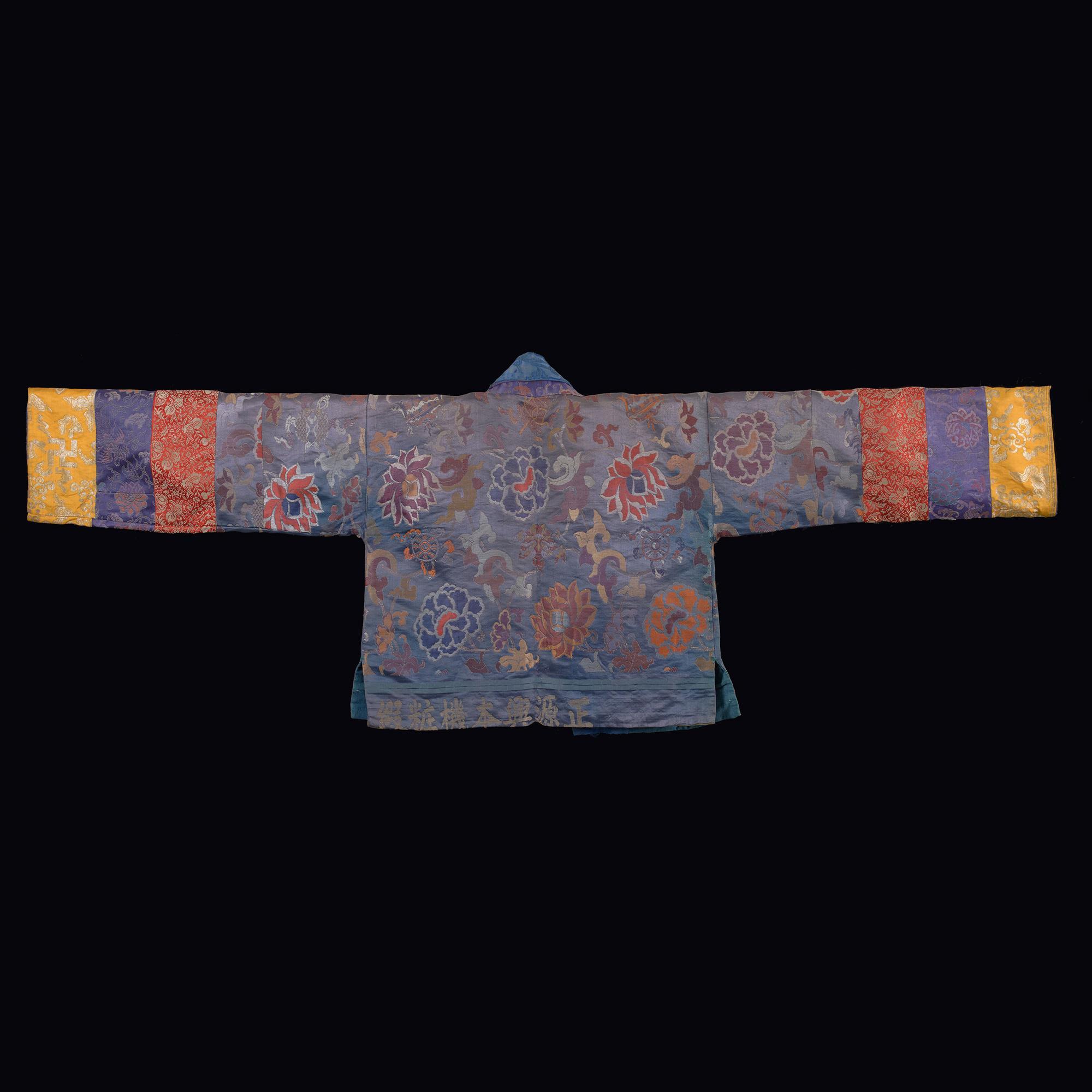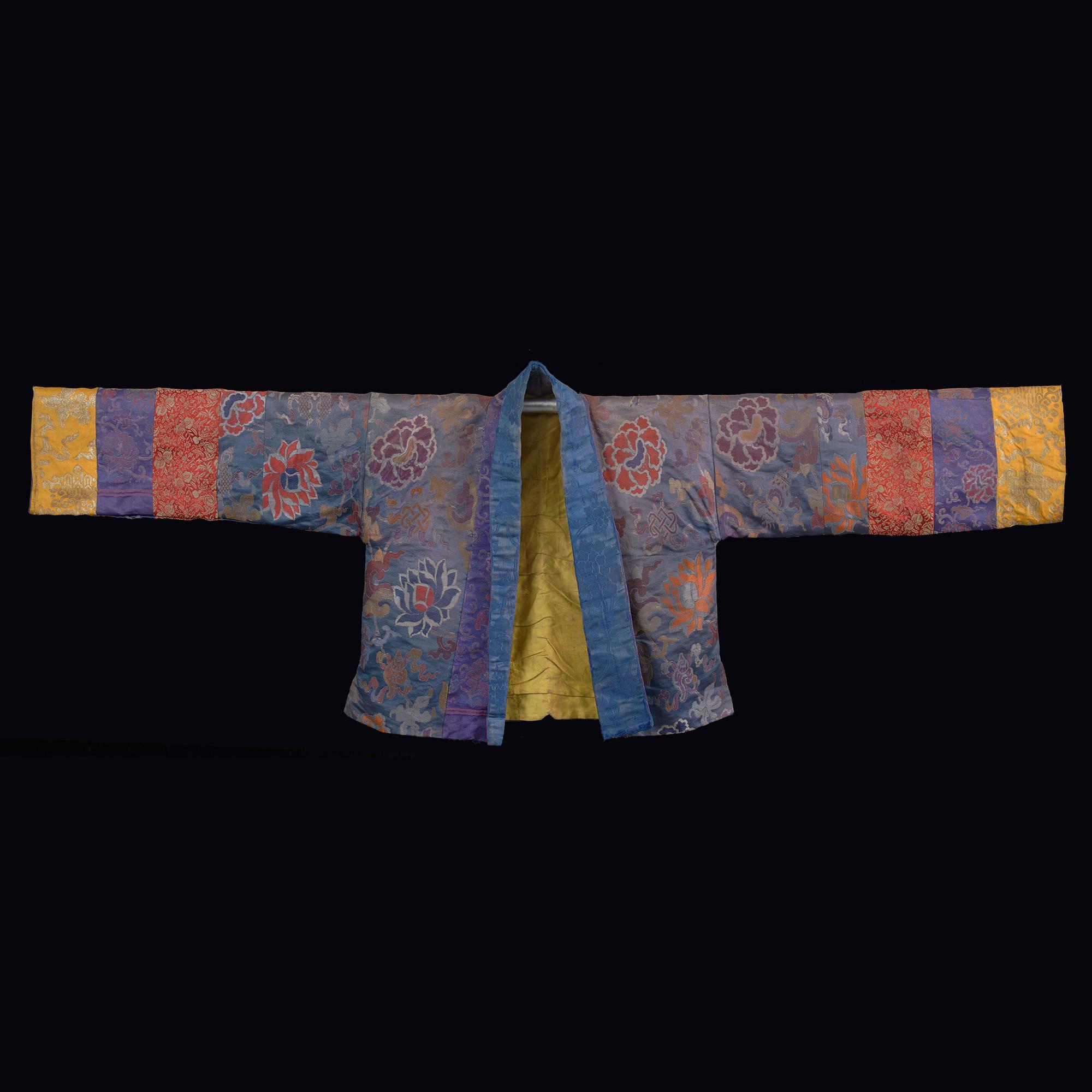 The composite nature of this garment, is typical of the many Tibetan costumes fabricated from a variety of tribute silks donated to Buddhist monasteries from China.