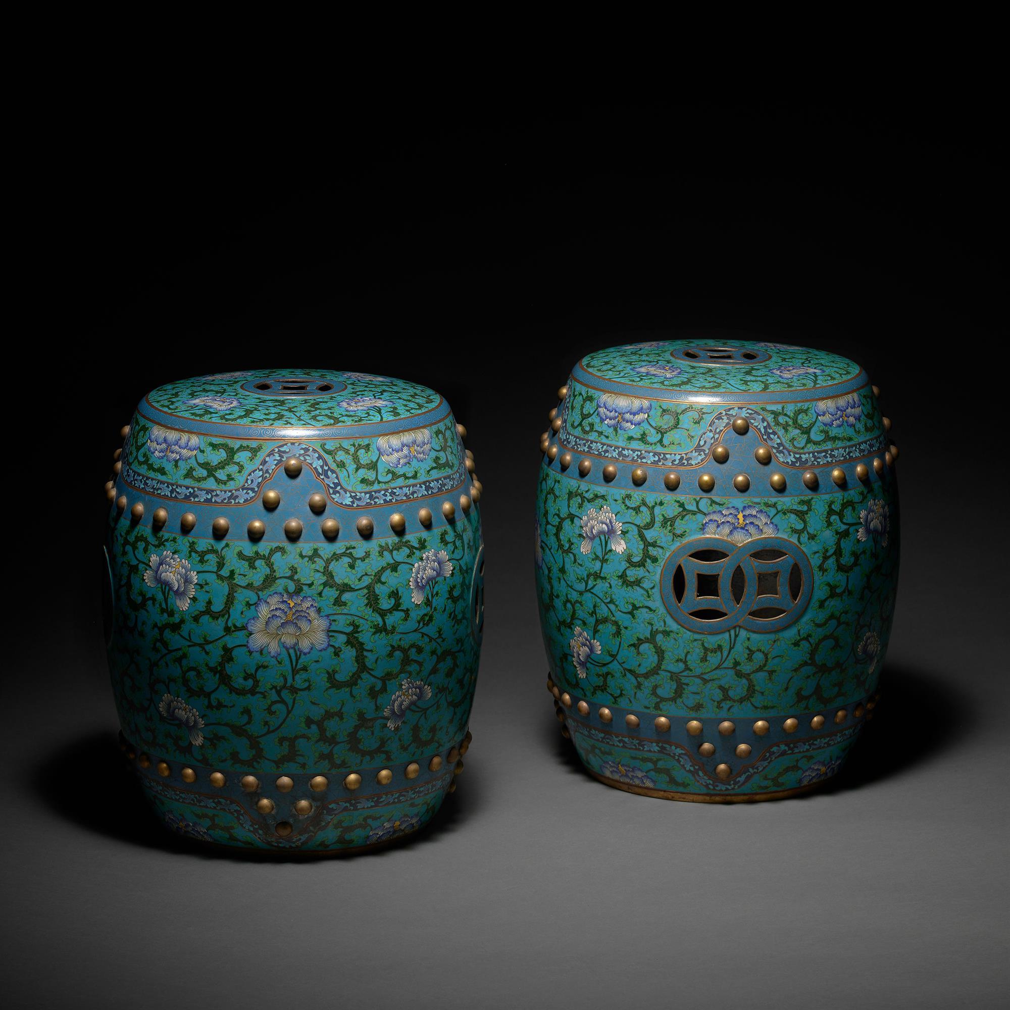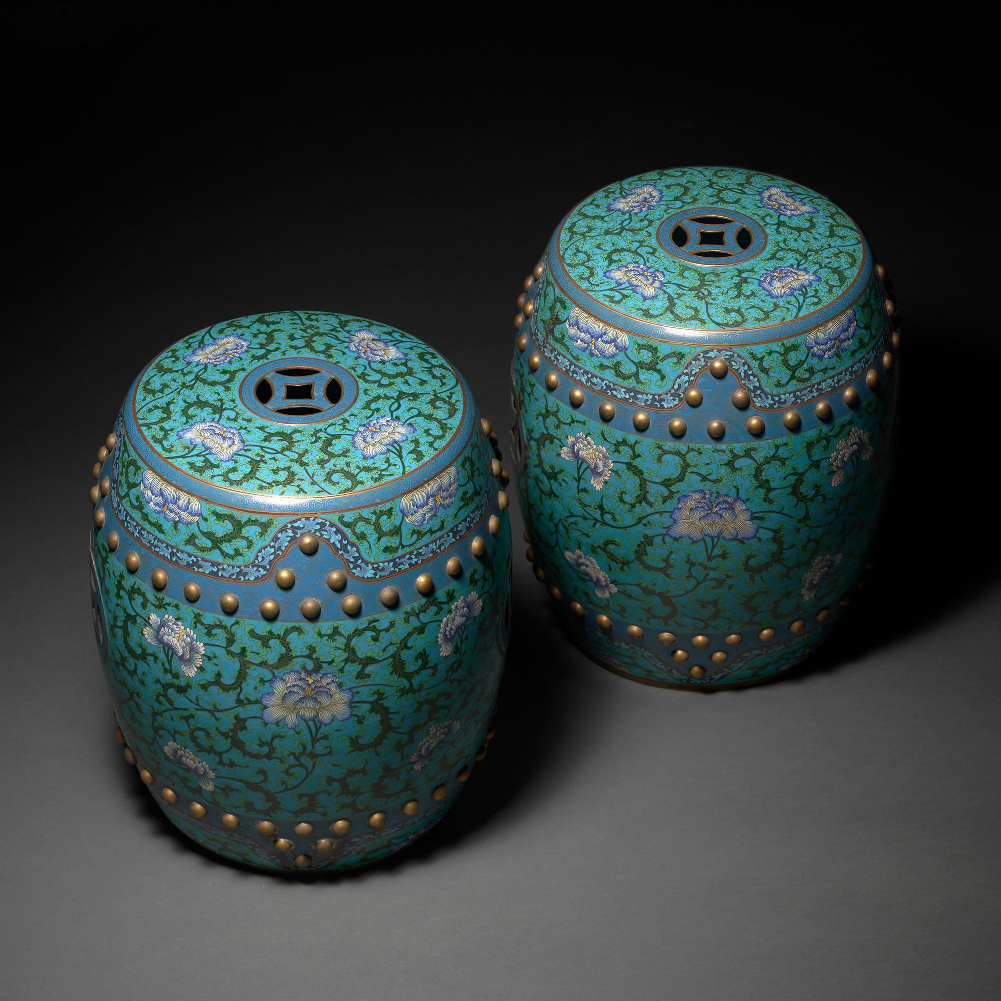 A very unusual pair of cloisonné enamel barrel-form stools, decorated around the sides and tops with a continuous bank of peonies, and scrolling foliage in varying shades of green. All set on a turquoise ground between gilt studs.