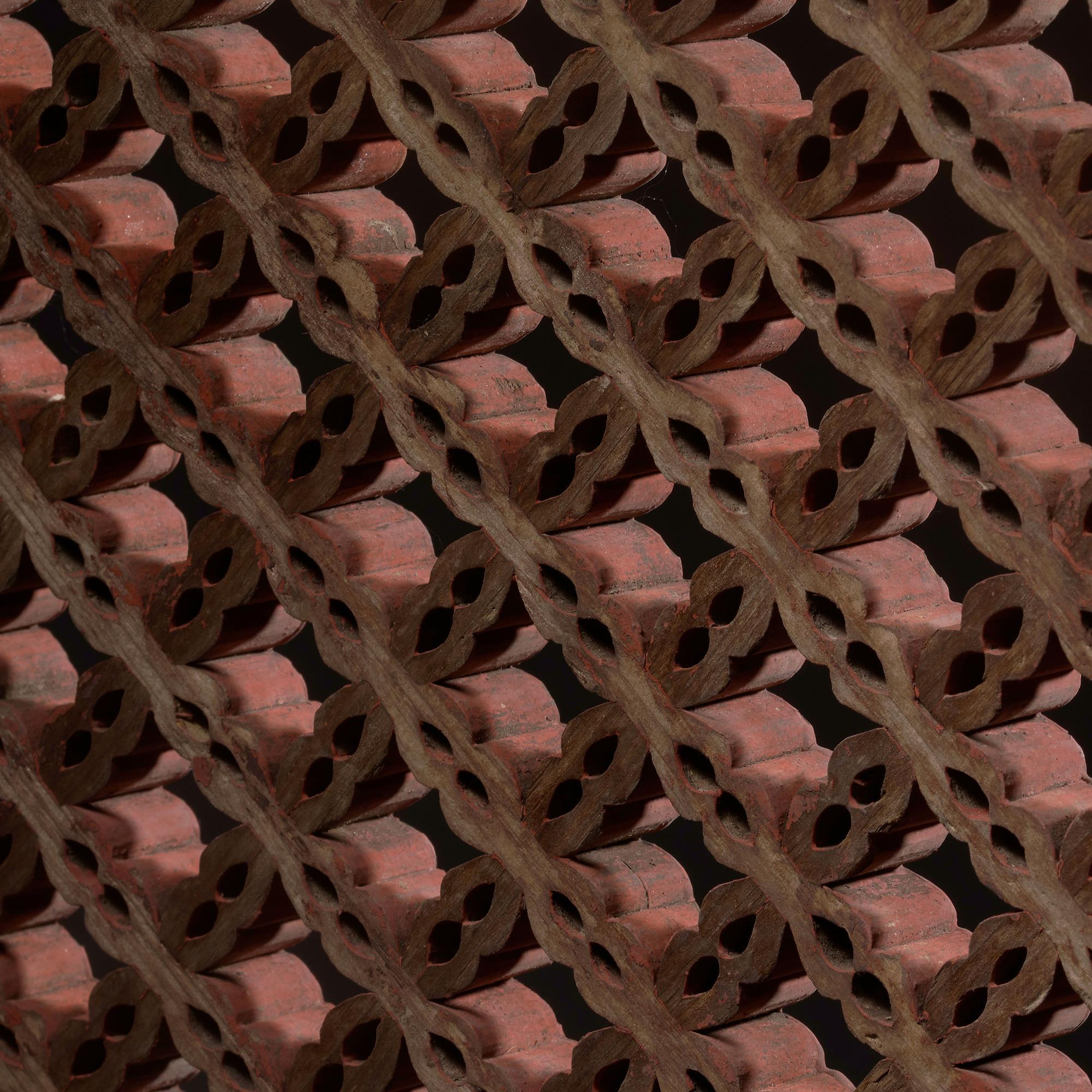 A Pair of lattice wooden windows with repetitive diamond and figure of eight pattern, deeply carved with hints of remaining red pigment.