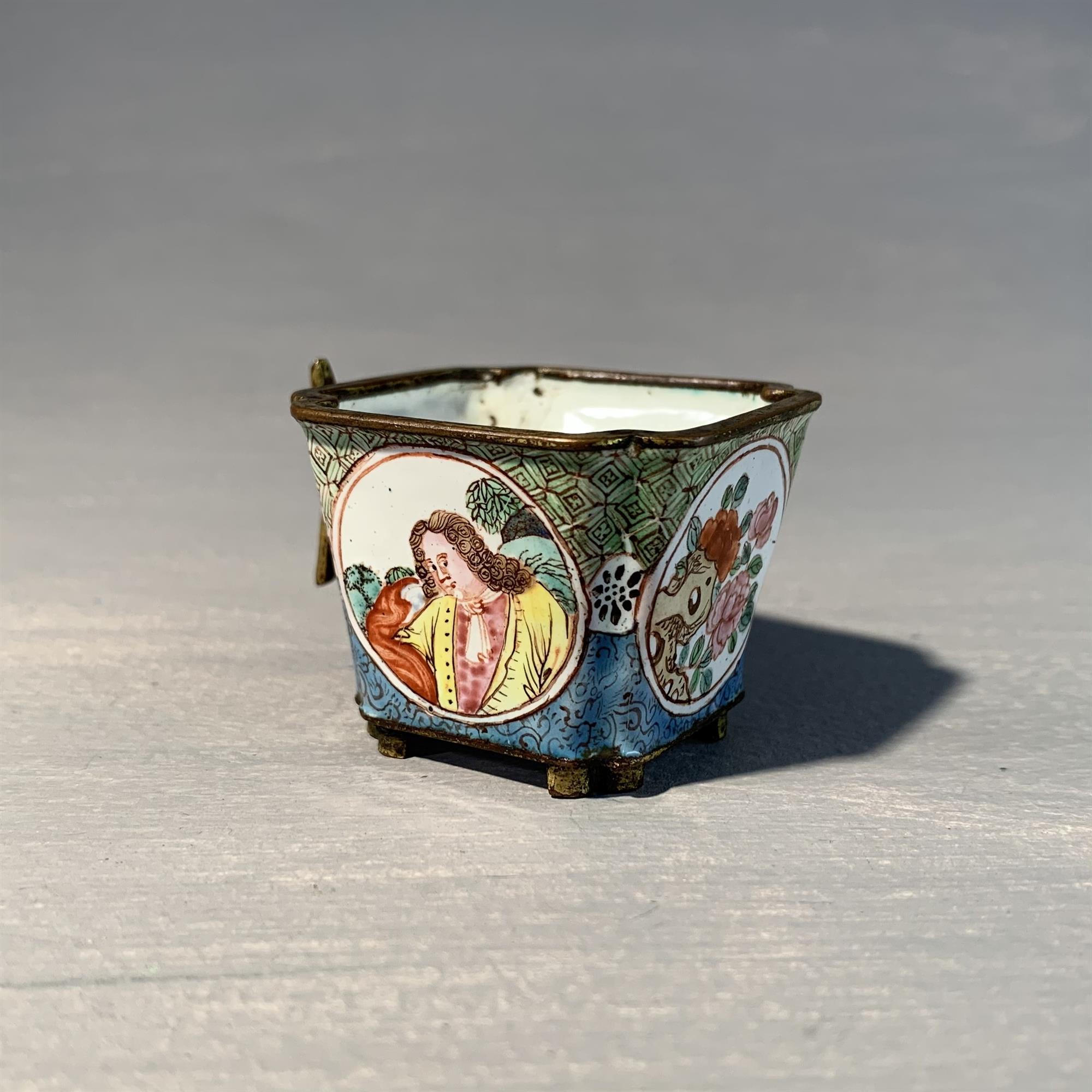 A rather unusual Canton enamel, square form wine cup with indented corners raised on gilt feet, with a gilt handle and two sides showing views of a European lady and gentlemen, the other two with peonies amongst rock work.
