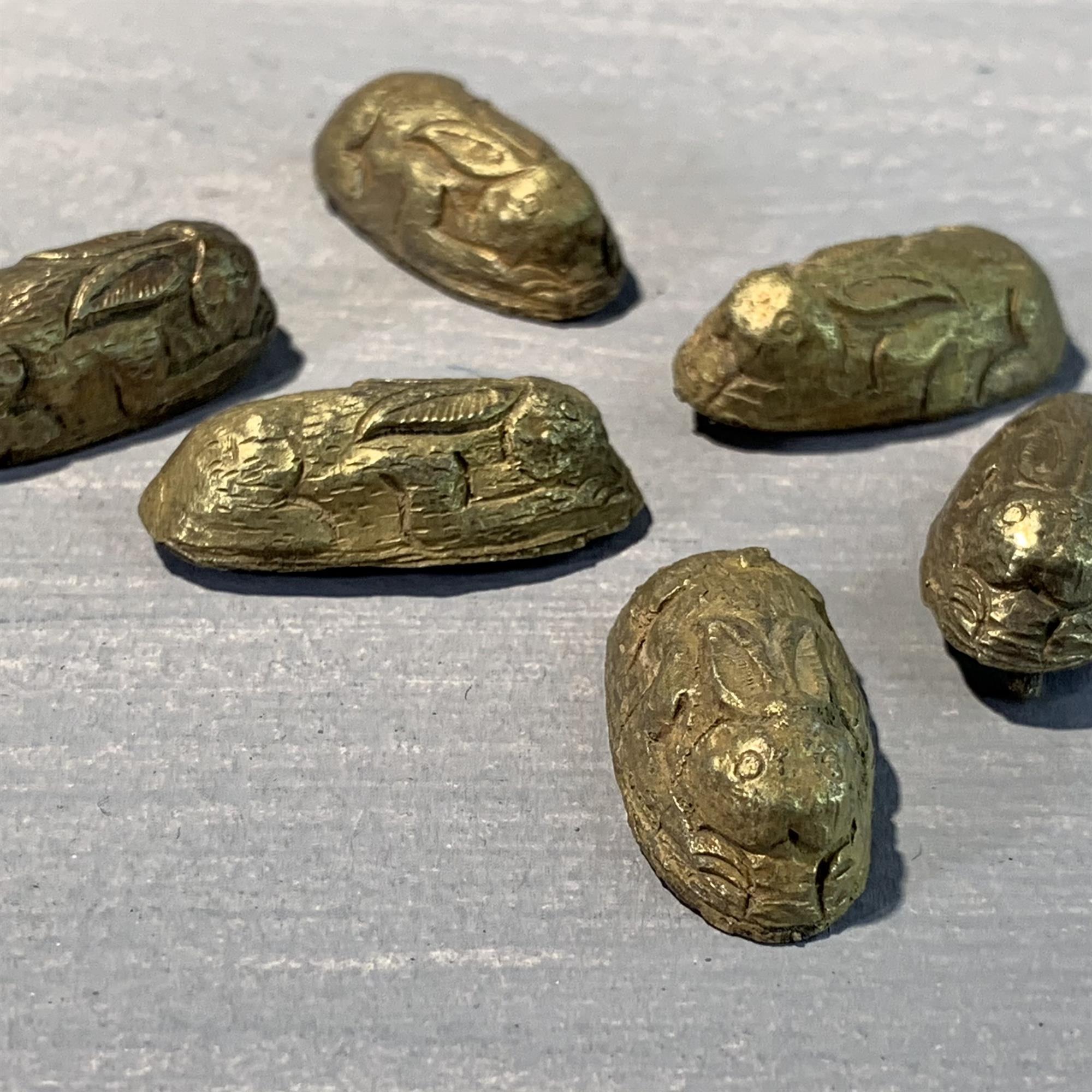 A group of six hollow gilt bronze miniature recumbent rabbits, each from original casts.