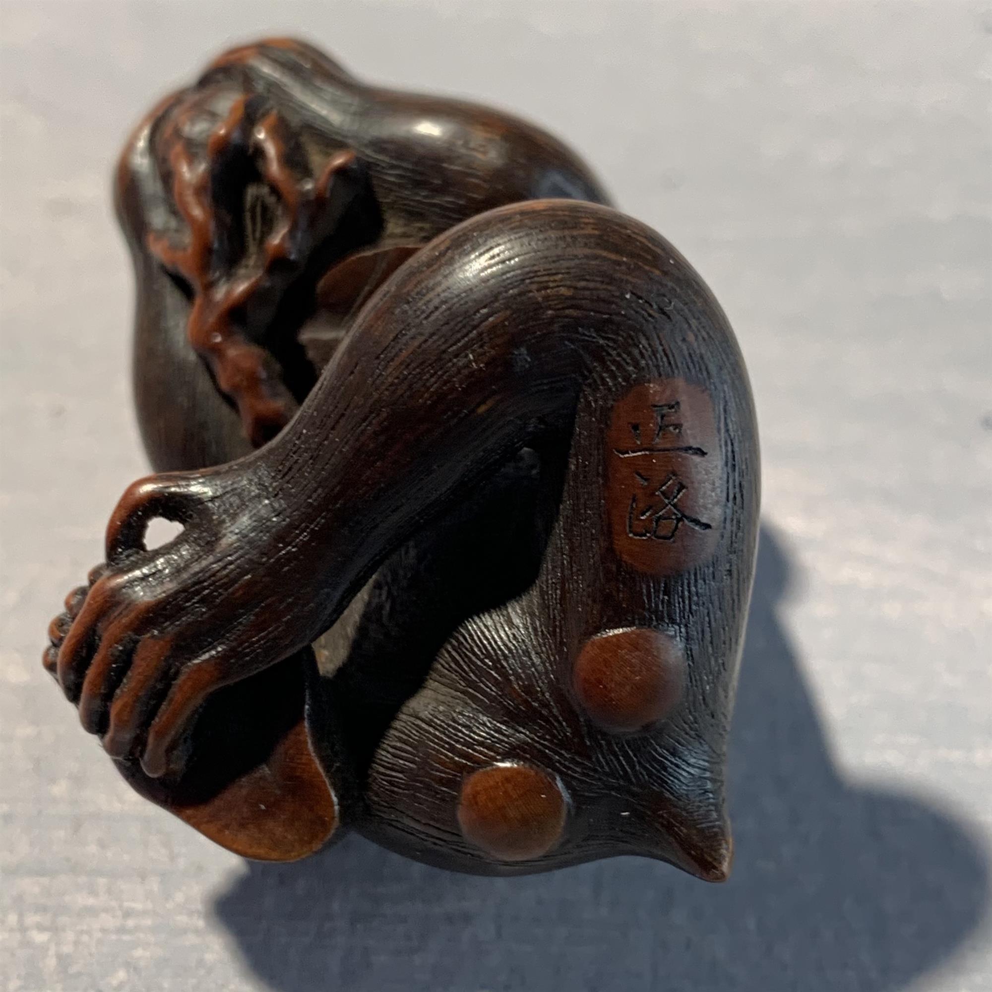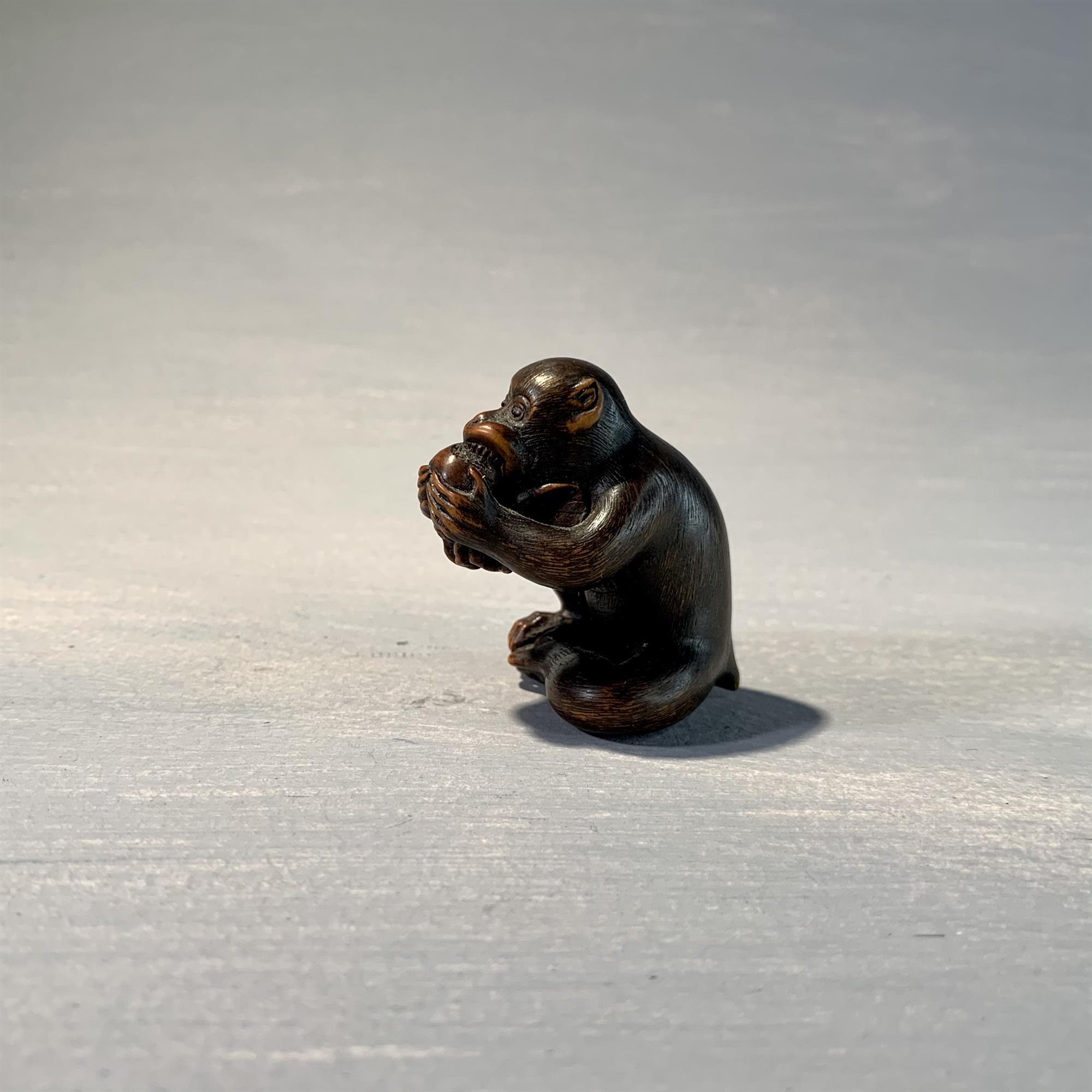 An exquisite boxwood model of a squatting monkey clasping a peach. The hair finely rendered, signed to his leg.