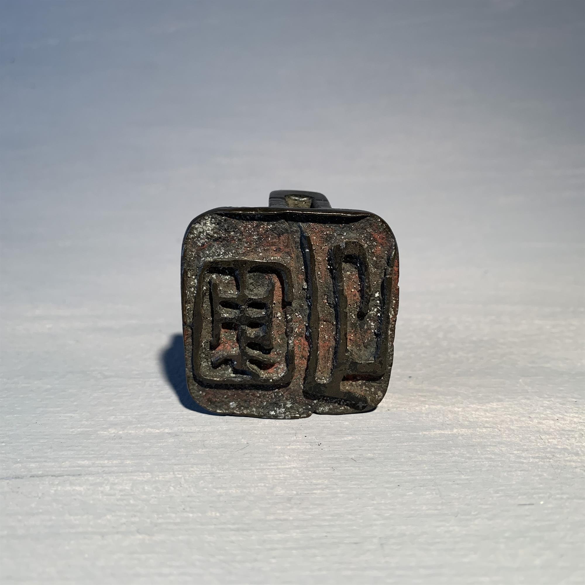 A cast bronze seal with four rectangular handles and a central spike for a candle.