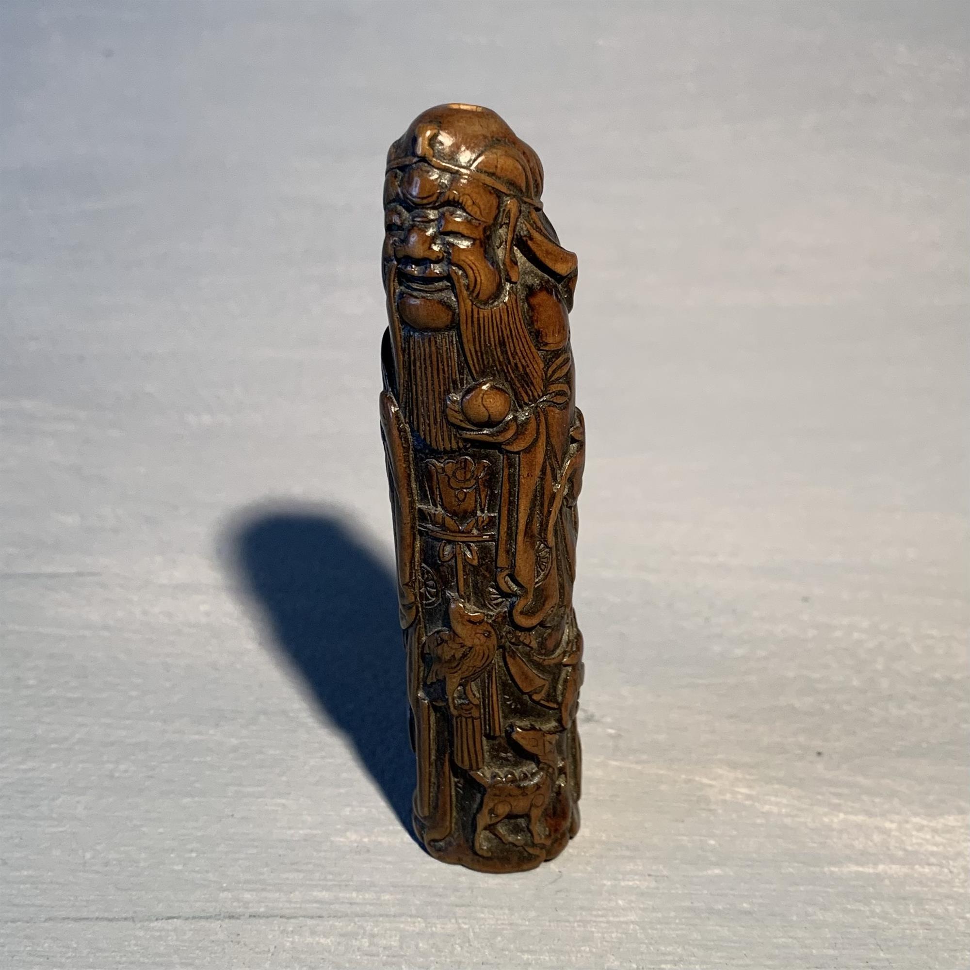 A well carved standing bearded figure of a God holding peaches, his long robes tied at the waist. He is surrounded by auspicious animals including deer, bats and a falcon.