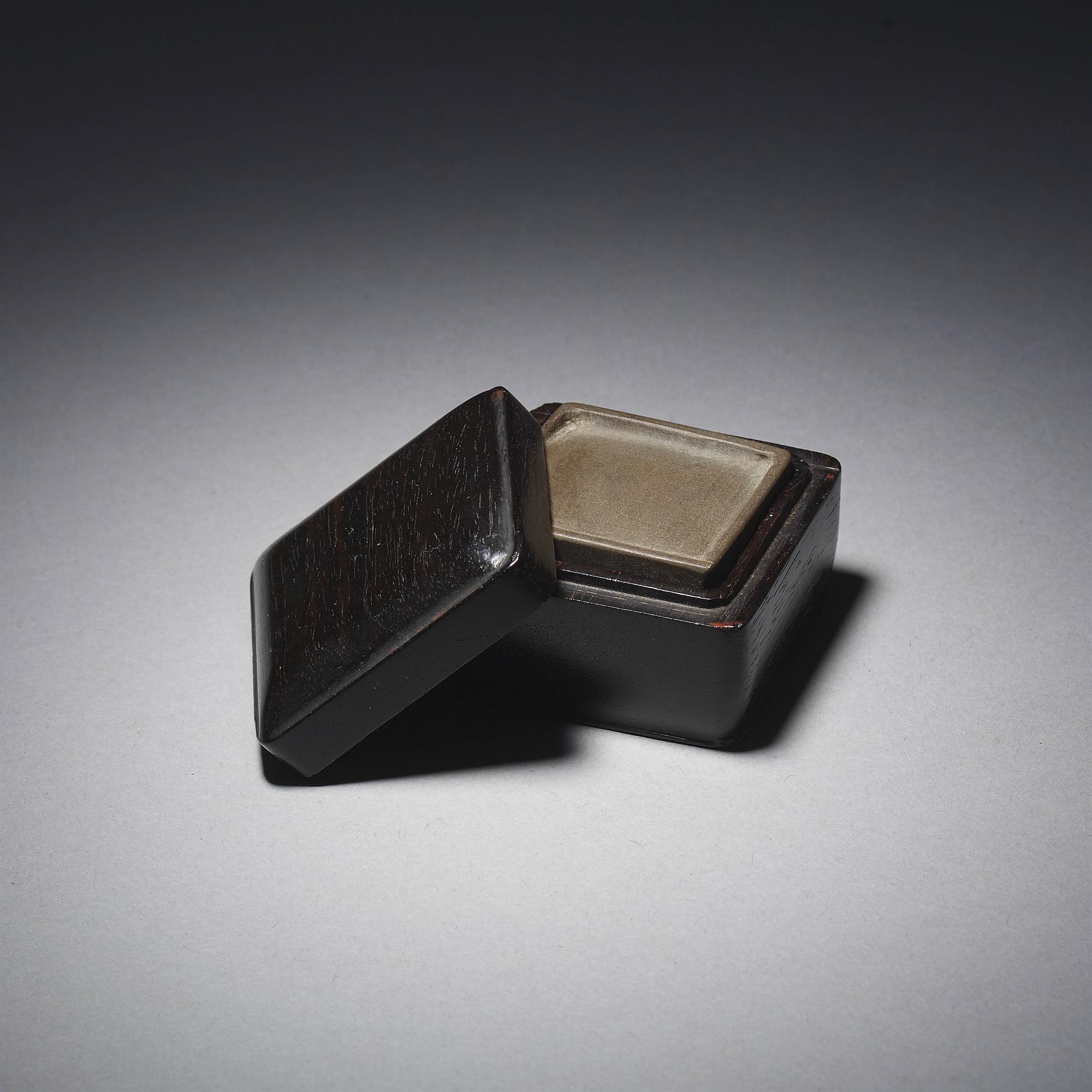 A miniature square zitan box and cover with beaded edging, enclosing a duan inkstone.