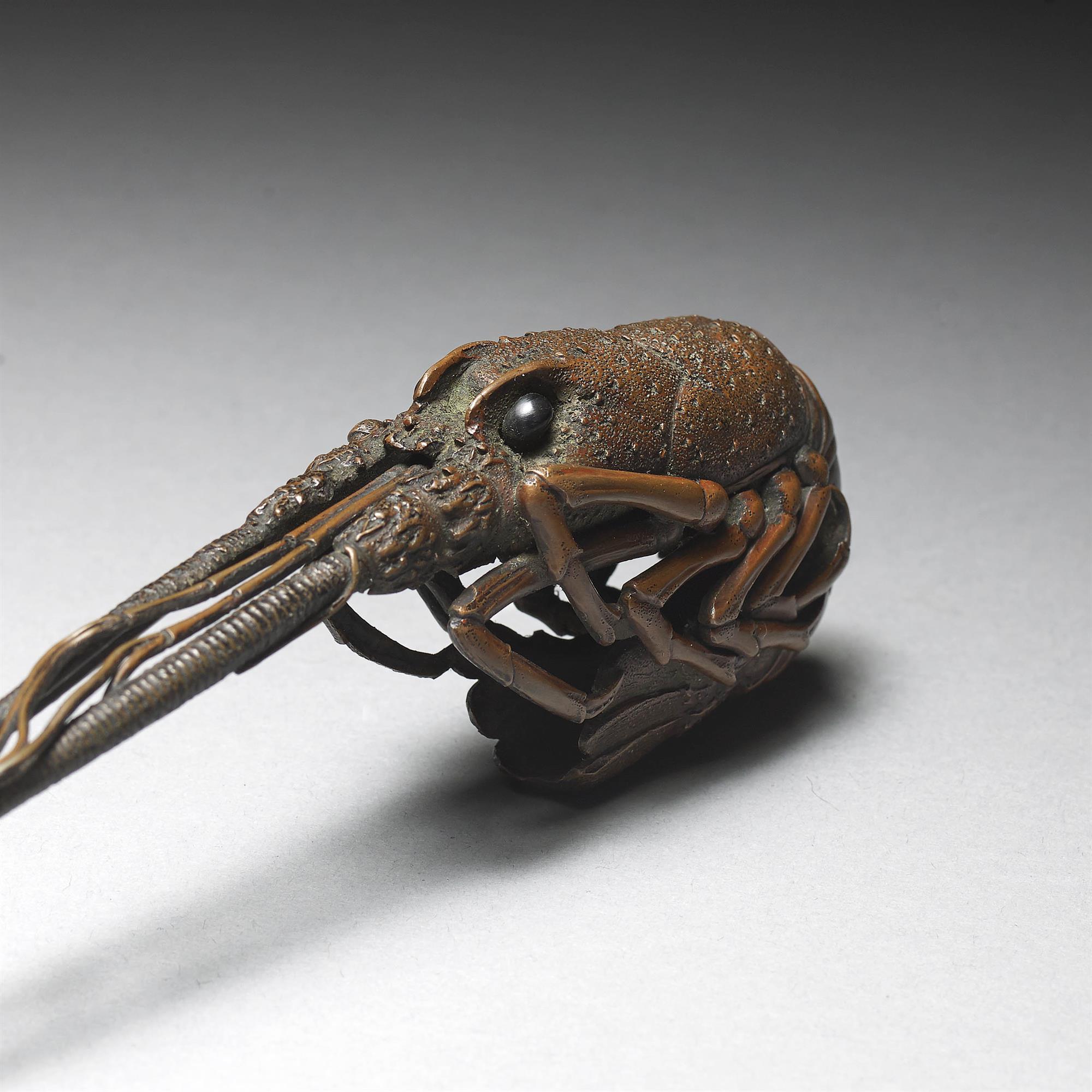 A copper sword scabbard terminal, finely cast as a crayfish, the eyes in shakudo.