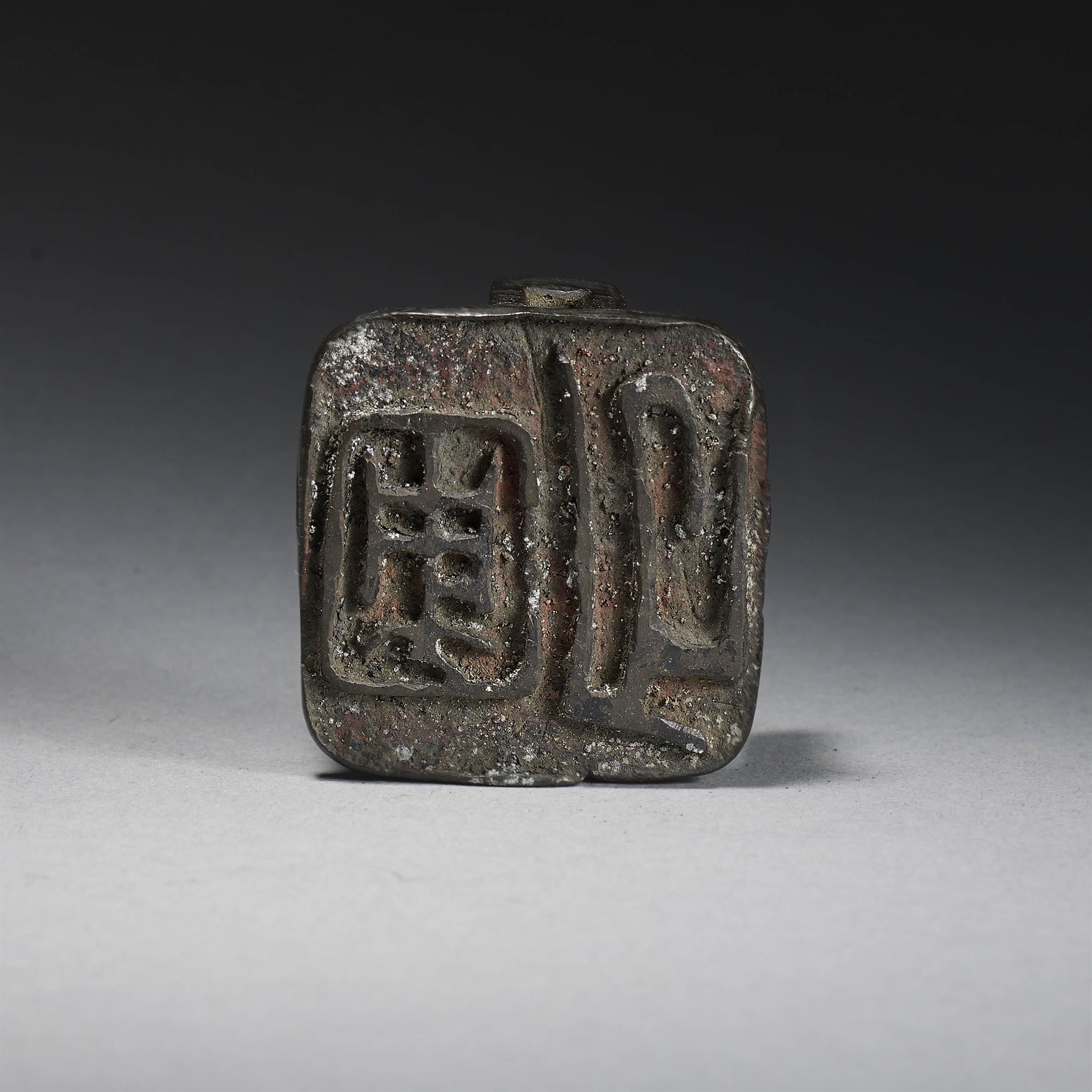 A bronze square seal modelled as a pricket candlestick, the patina of deep tone. The seal translates as Gua-pu (literary name ‘Melon Field’)