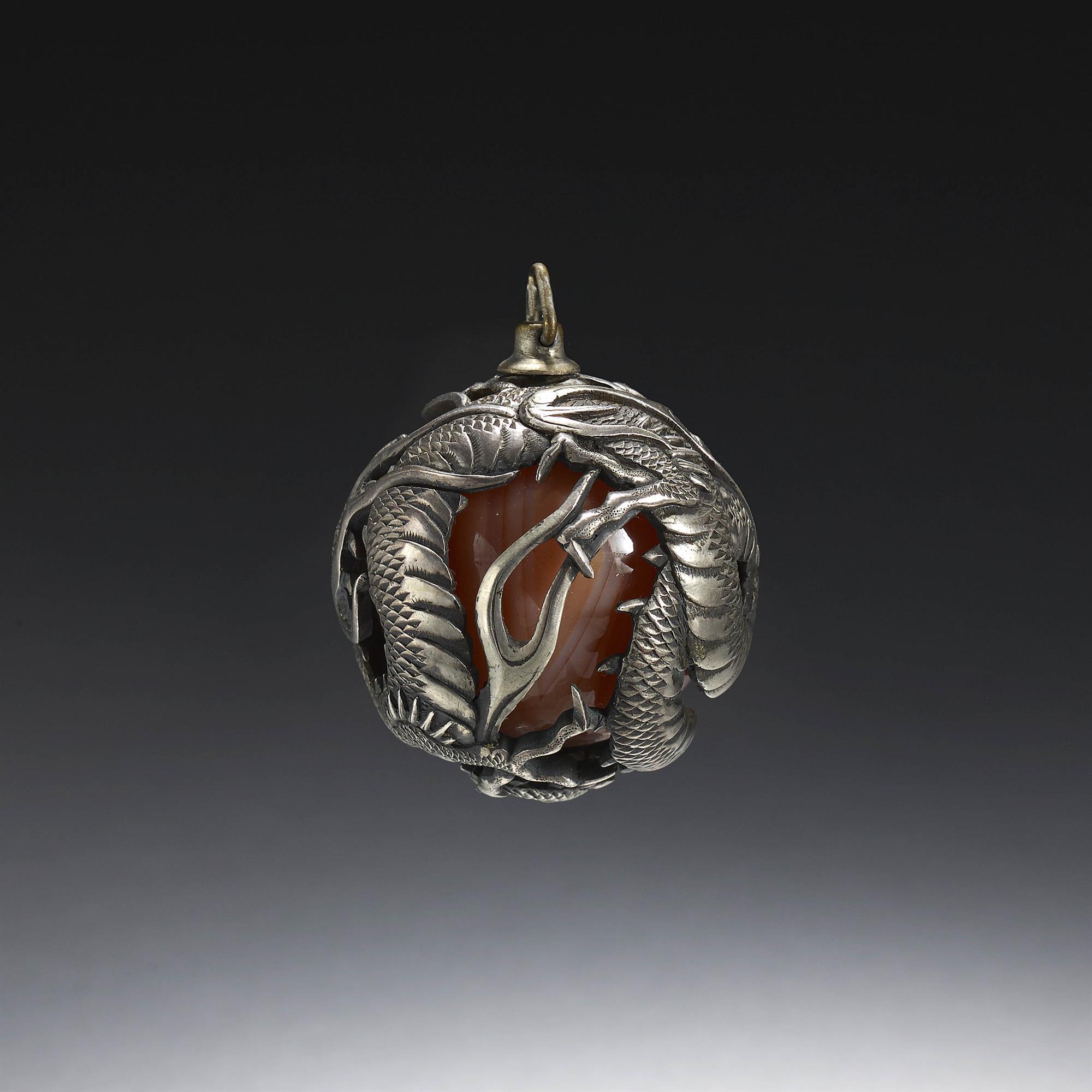 A carnelian agate pearl enclosed with a pierced coiled silver dragon, its eyes inlaid in gold.