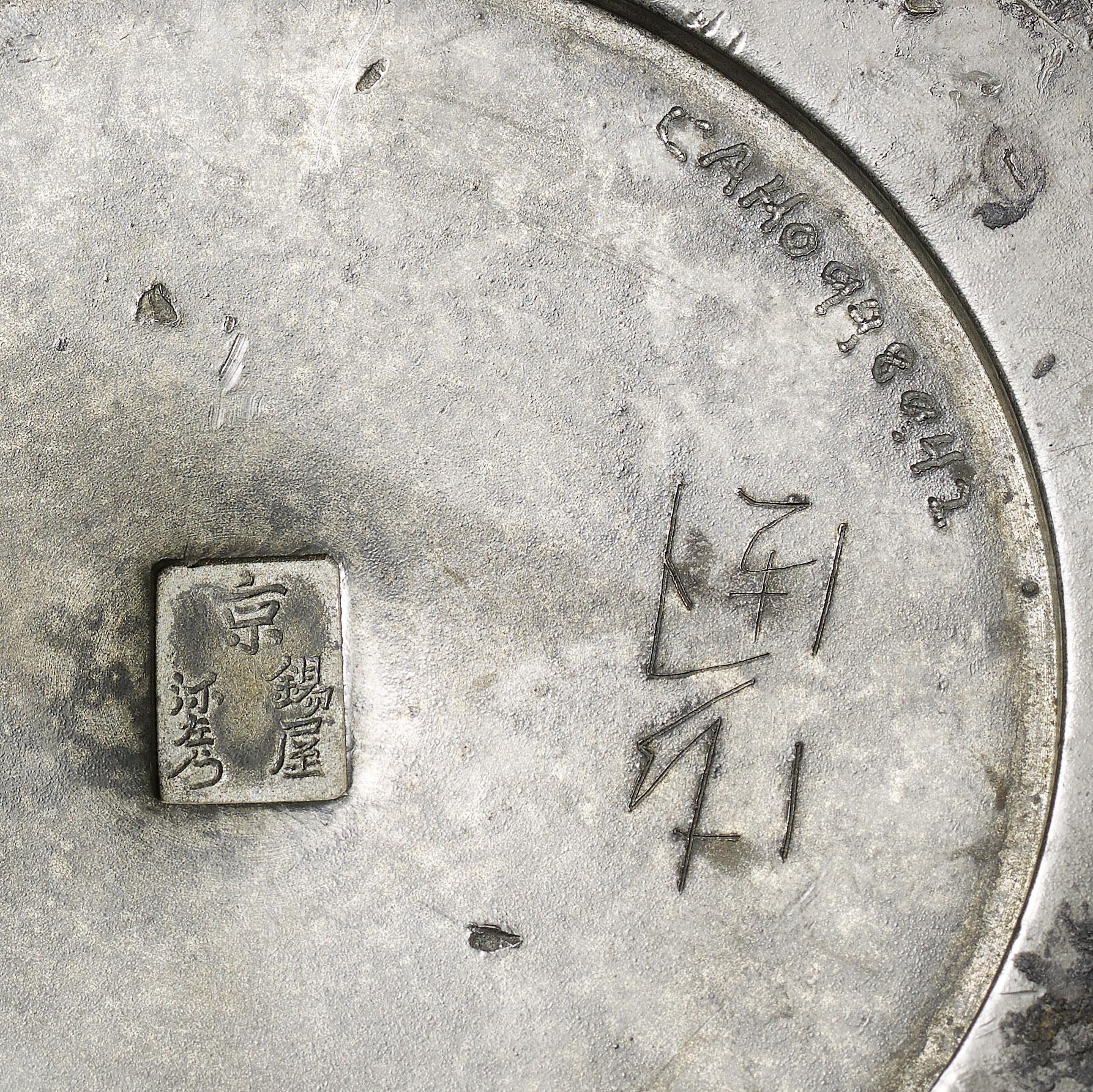 An unusually large pewter tea jar and cylindrical cover with inset lid, the ovoid body rising from a flat base to a cylindrical neck. Impressed mark Yazaemon, Pewter shop Suzuya in Kyoto. NB: The family business was established in 1887 as a pewter retail.