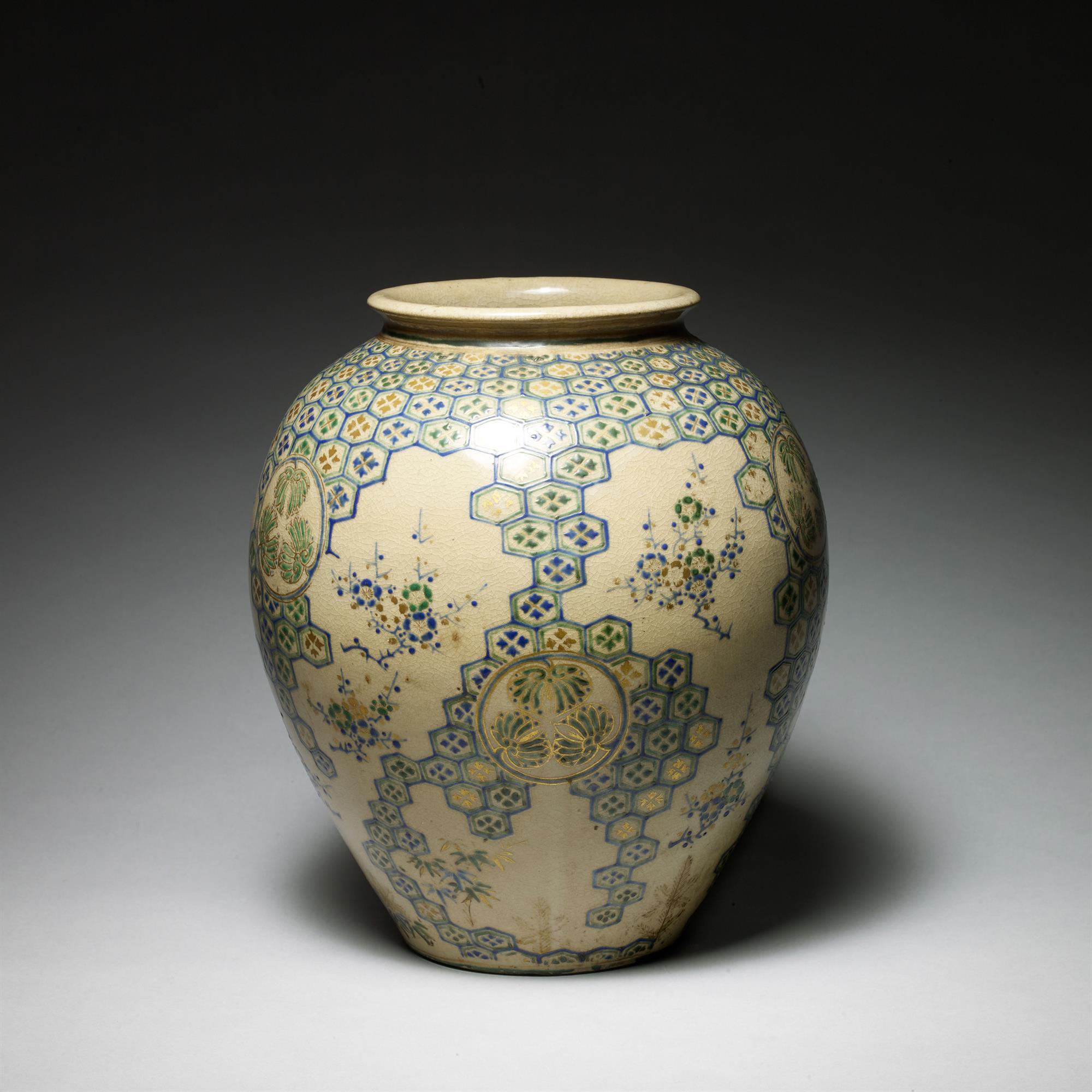 A beautifully designed Kyoto vase with blue and green repeated tile design and floral embellishments and a paulownia mon (crest).
