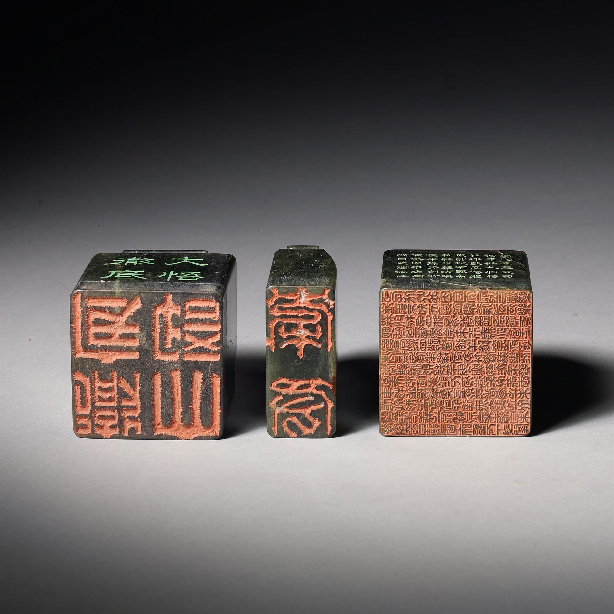 A set of three large dark green soapstone seals all with pierced, curved handles inscribed with poems on silk stands.