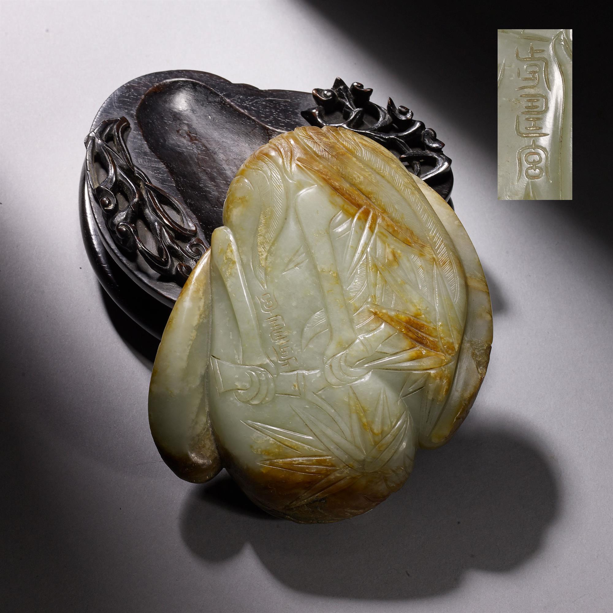 A russet and greyish-celadon jade model of a resting phoenix, the head turned into the wings, and the legs pulled up underneath the body.