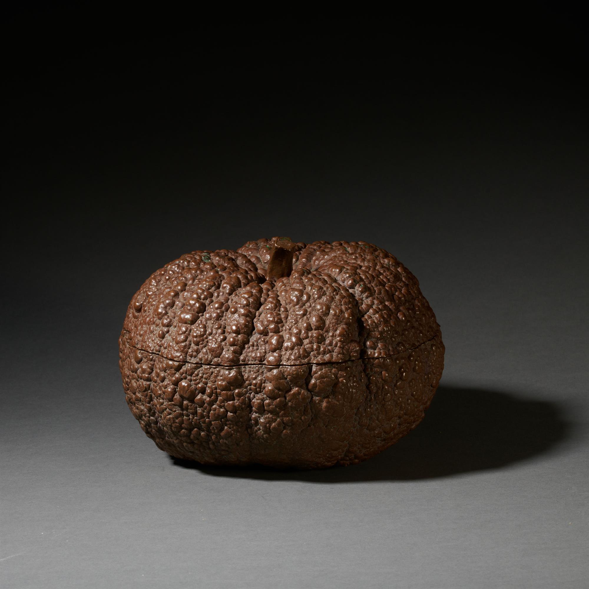 A curious copper box in the form of a pumpkin, the exterior body realistically cast, and the interior in red lacquer.