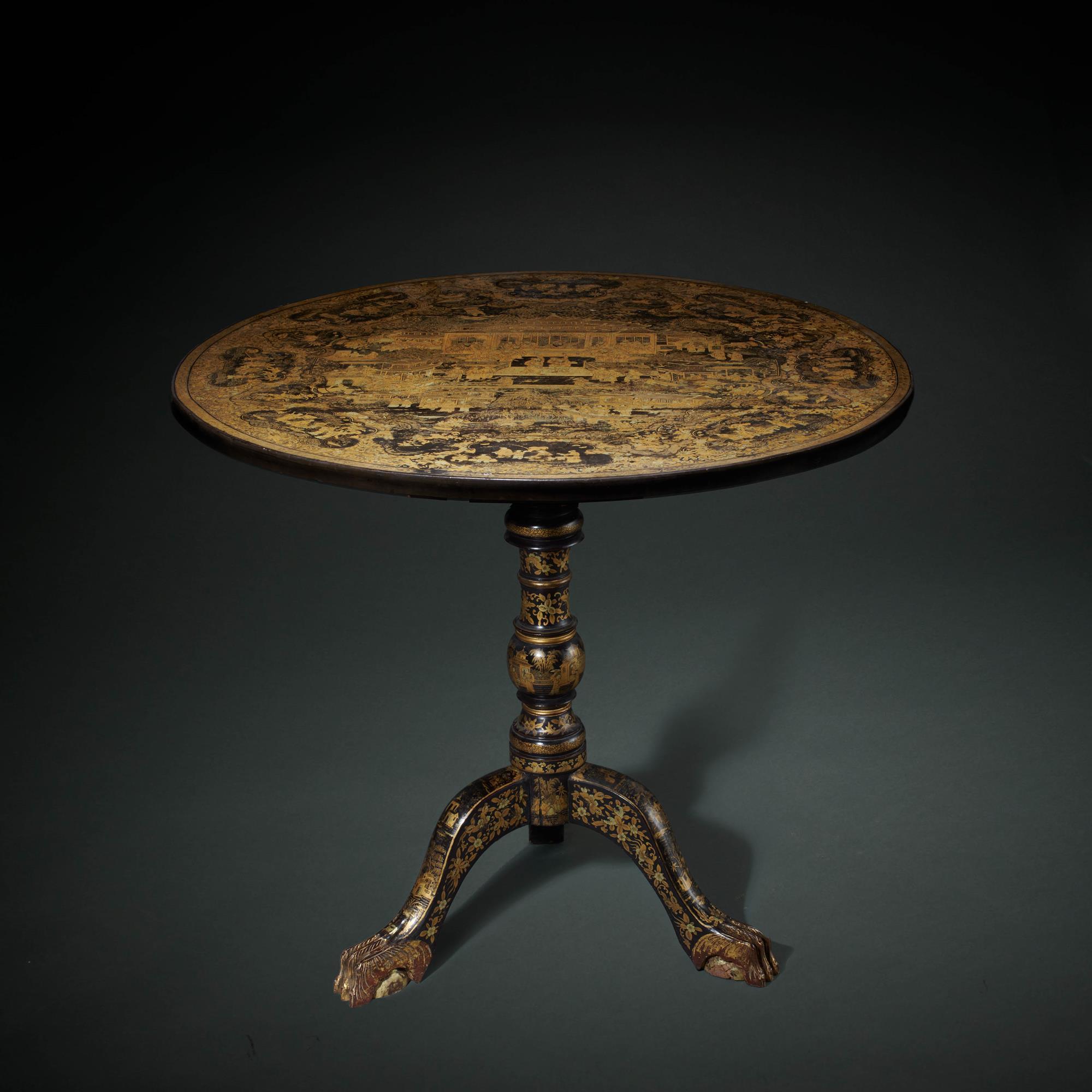 A finely lacquered circular bird cage tilt top table, supported on a tripod base terminating with carved paw feet and turned column. The top profusely decorated with Chinese garden within cartouches. The centre depicting a palace with courtiers at leisure.