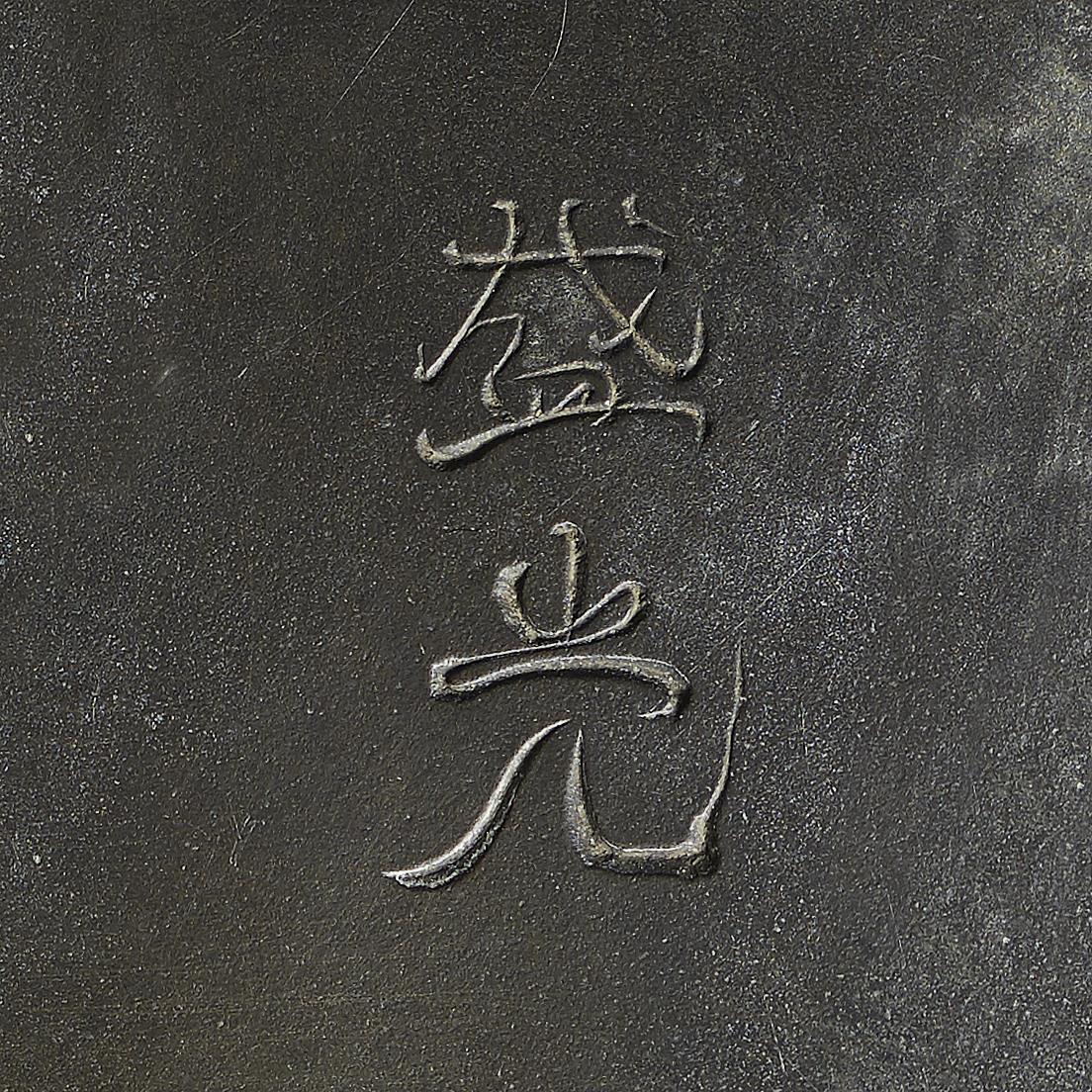 A heavily cast bronze vase case with a fine quality crayfish and clams, with an overall rich green patina. Signed Morimitsu