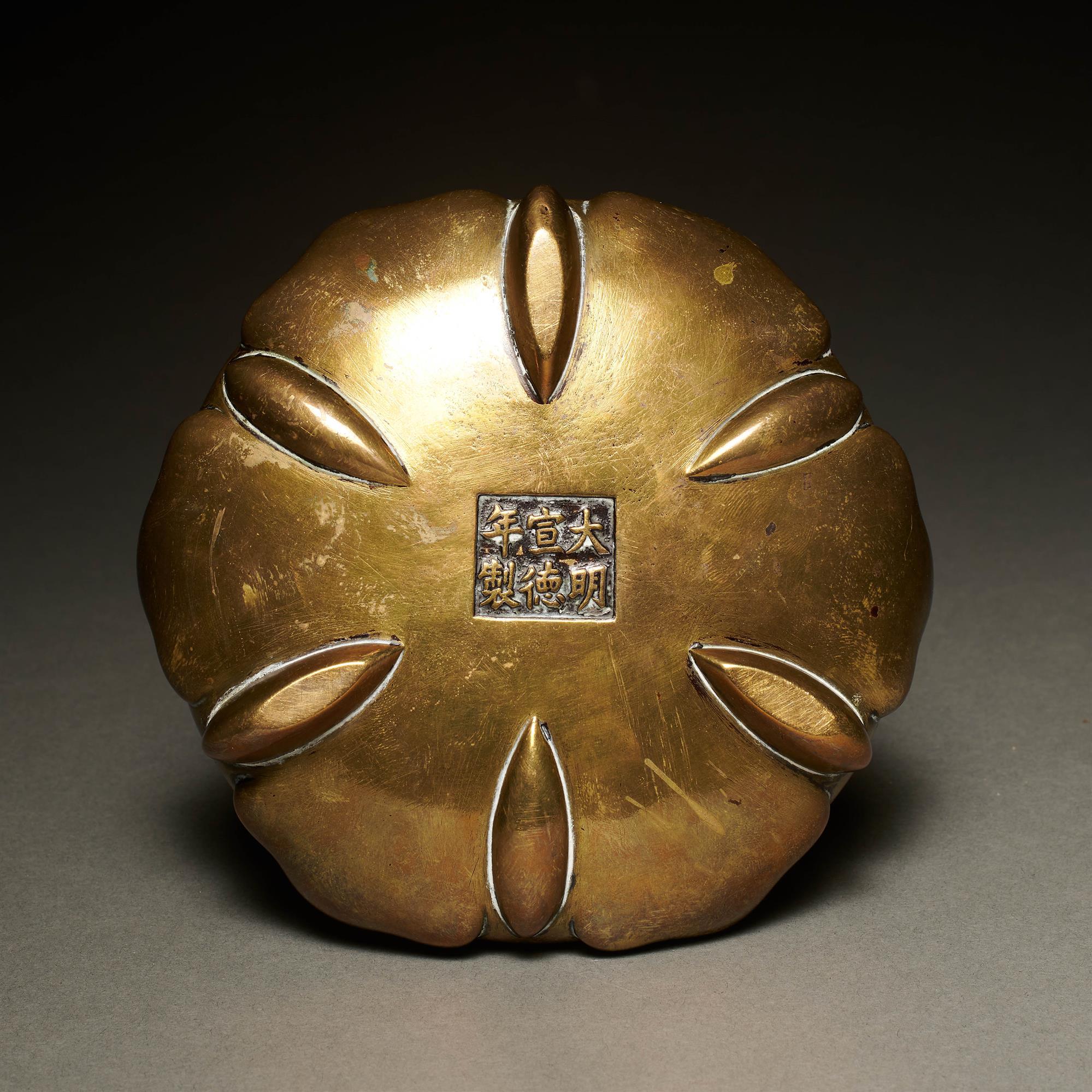 An unusual and well-formed incense burner, the base designed with six lappets, supported on six feet, with cast Ming mark.