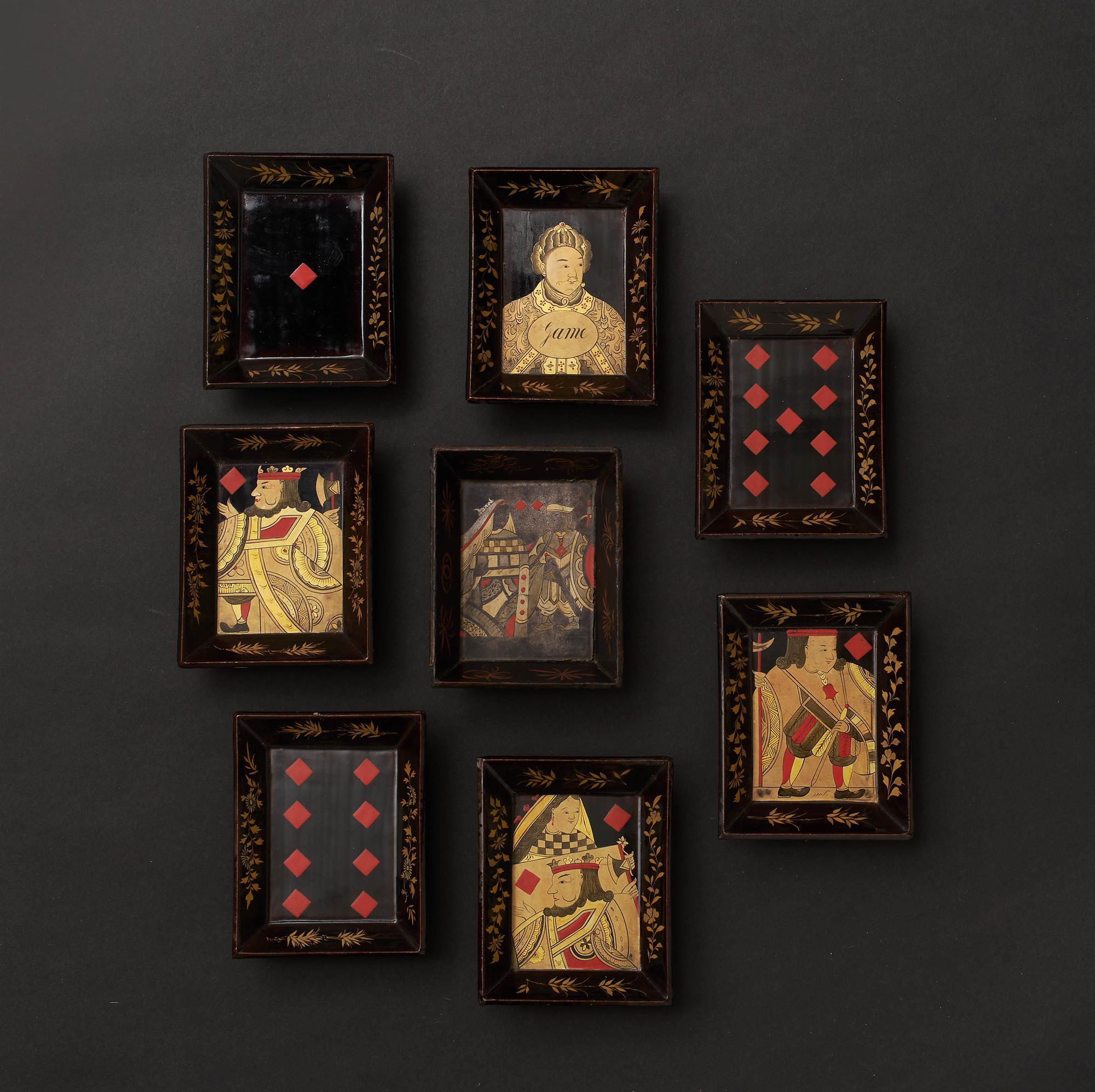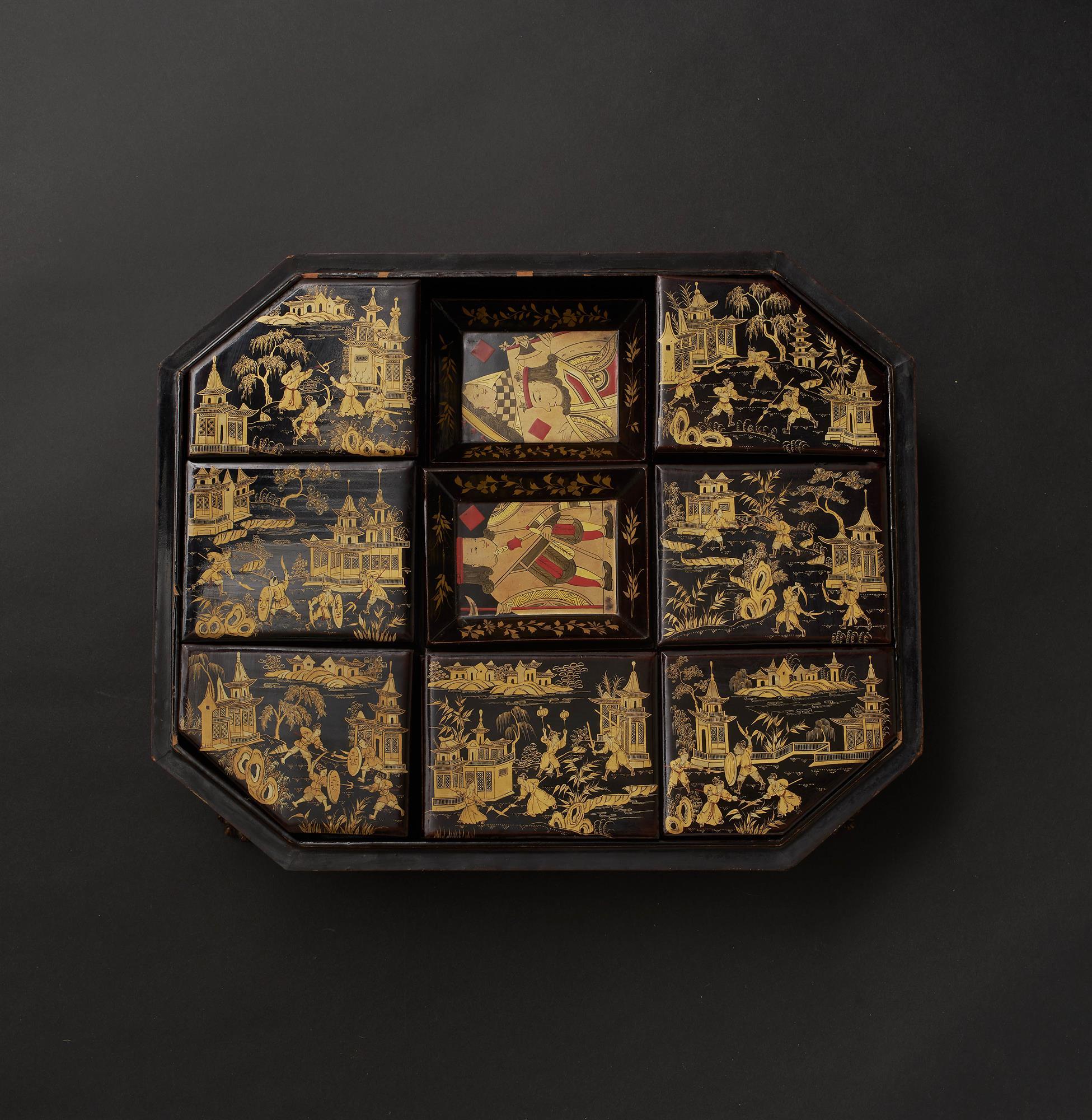 A lacquered black ground games box decorated in gold with soldiers and horsemen within palace grounds. The border with confronting dragons. The interior with seven further boxes and eight decorated trays. A small collection of Canton mother of pearl counters.