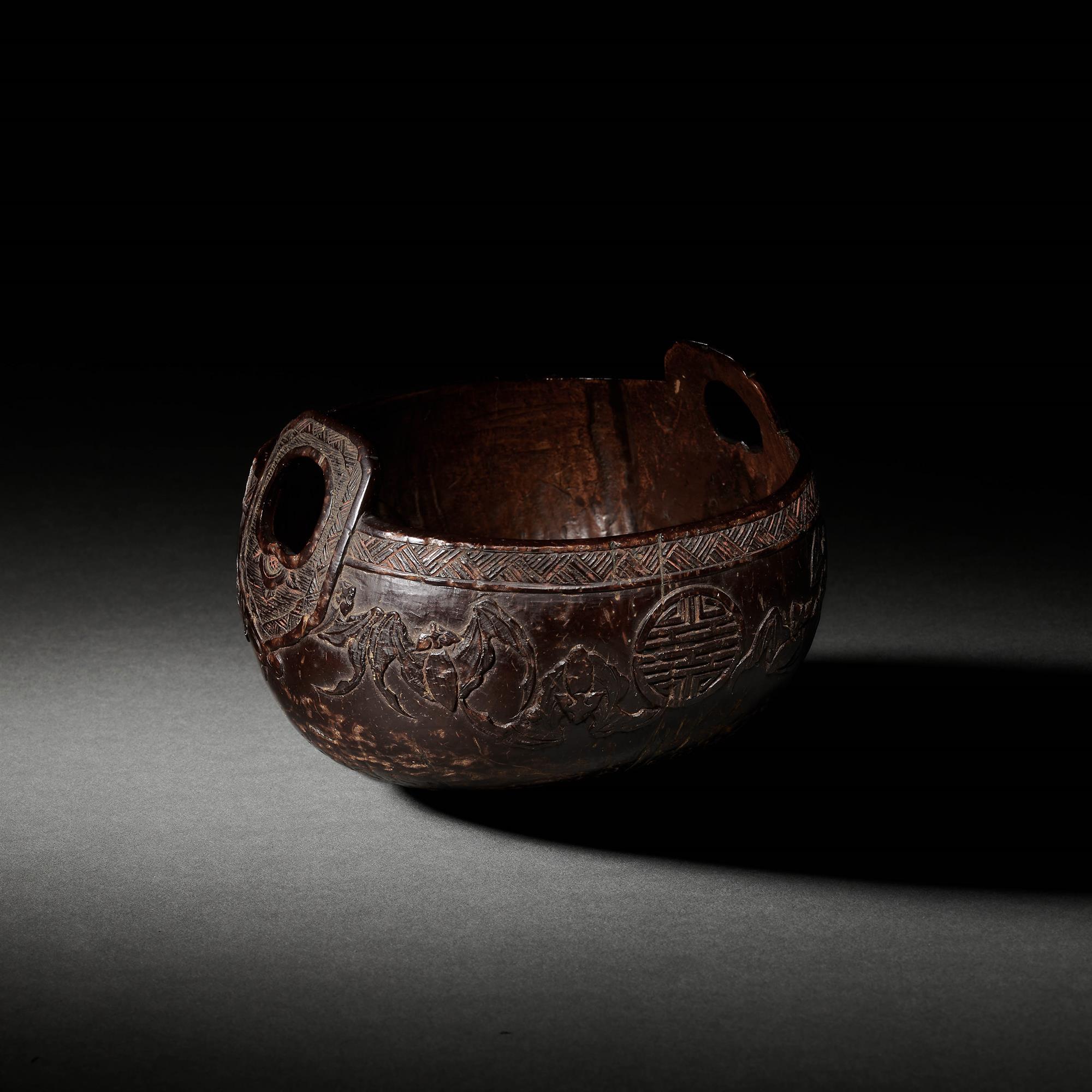 A two handled coconut bowl carved to exterior with a broad band of bats and shou symbols, below a narrow section of cross-hatch pattern, some red pigment remaining, the interior plain.