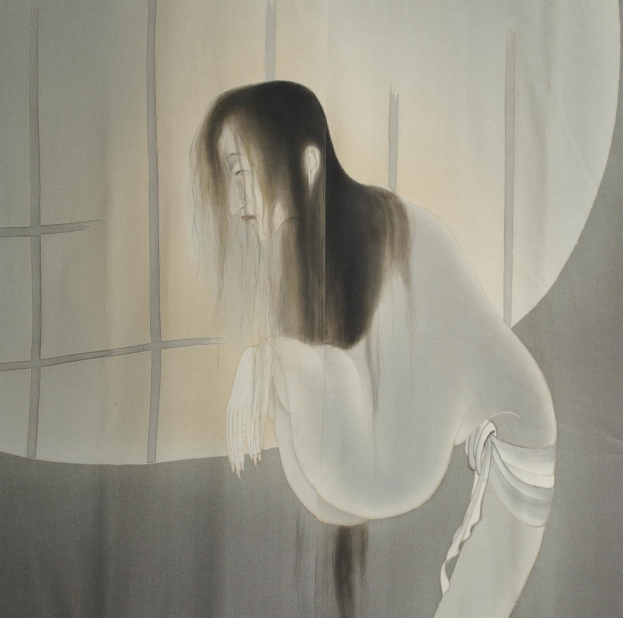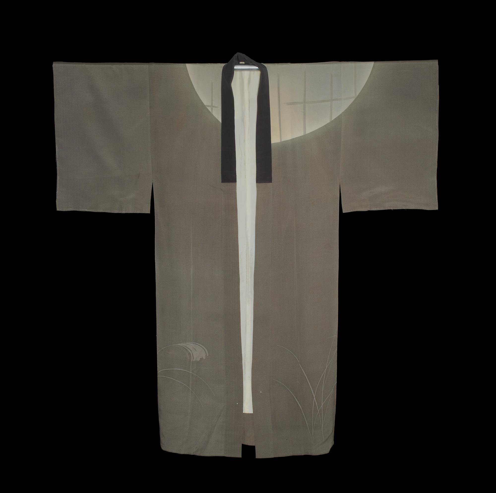 Grey silk Tsukesage kimono painted and embroidered with a ghost of an old lady.