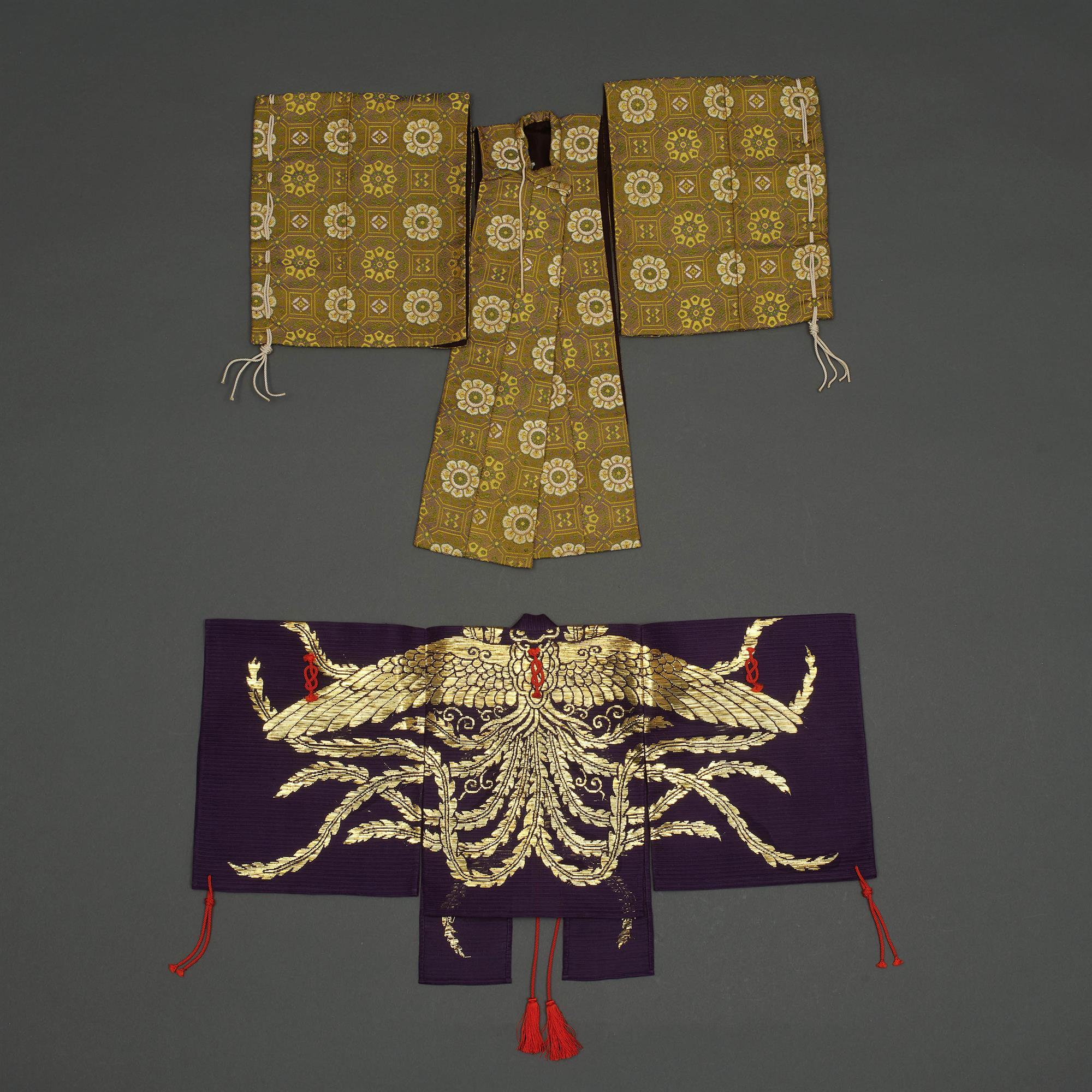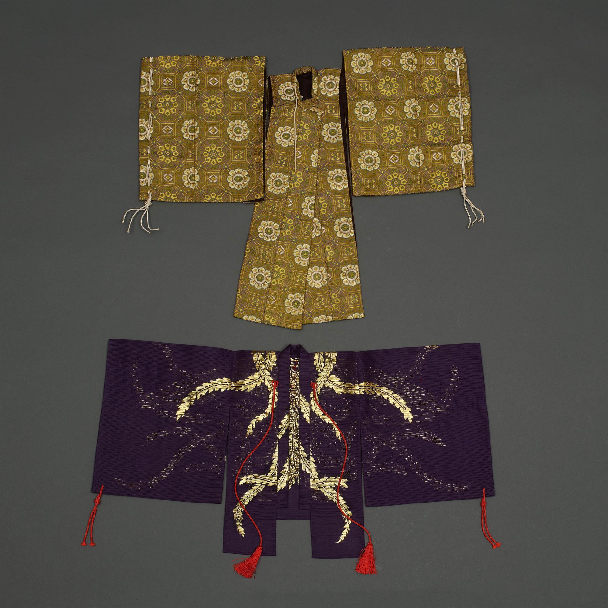 A collection of 15 exquisite miniature kimono and nohrobe. Finely embroidered in silk floss with gold and coloured threads and brocade patterns. Possibly shop examples or commemoration doll robes.