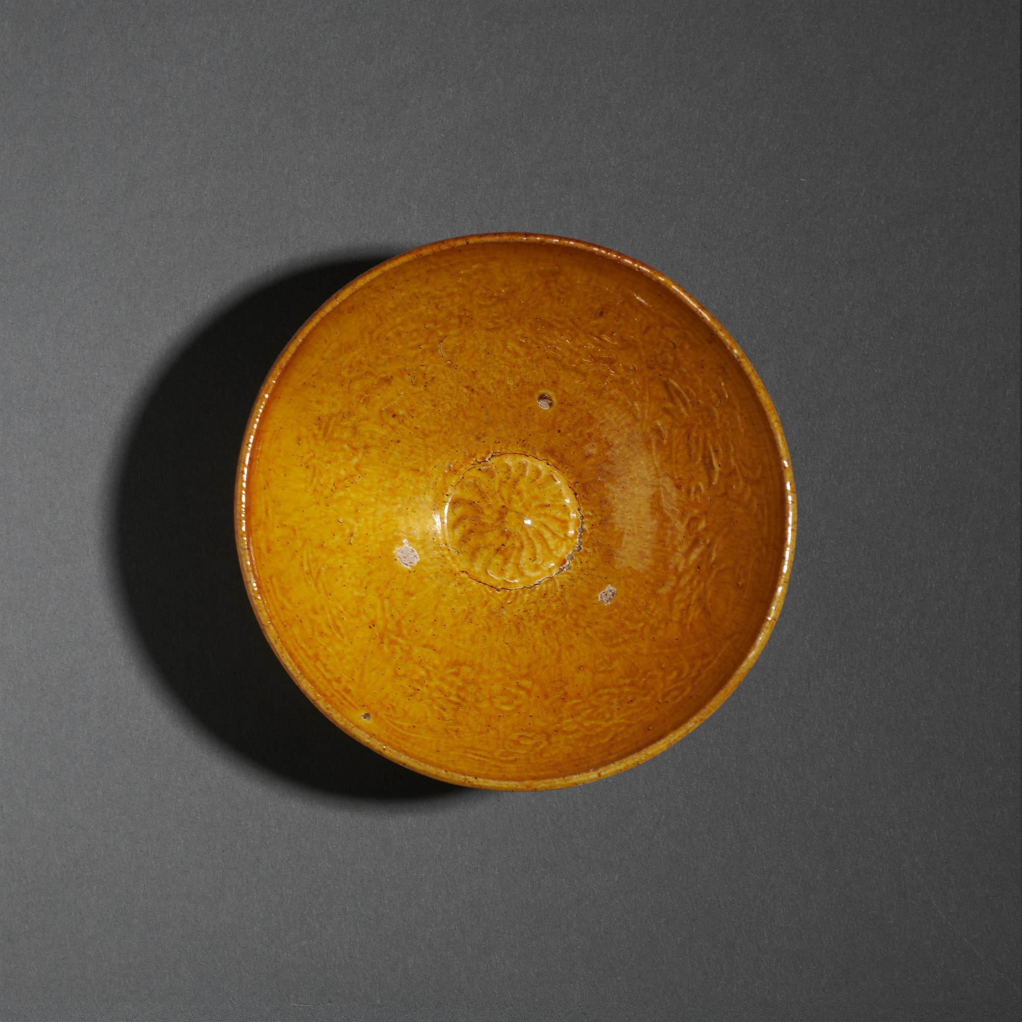 A Chinese amber-glazed conical bowl with moulded floral interior. Old Buckinghamshire collection