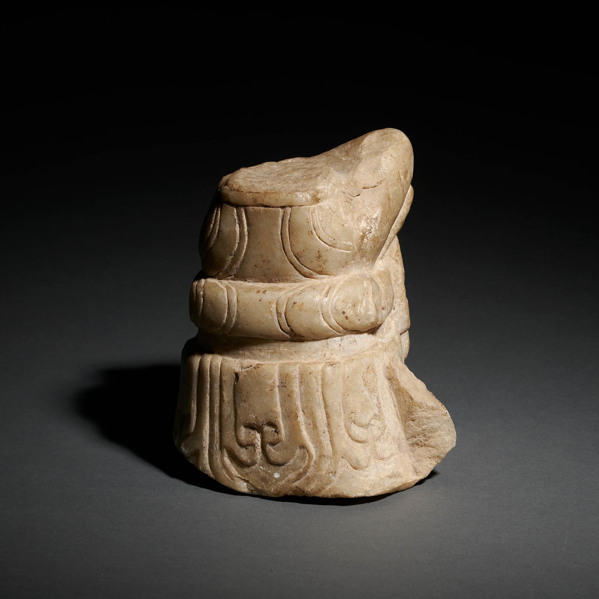 The lower part of a seated Buddhist figure, with a crossed leg, within flowing robes.
