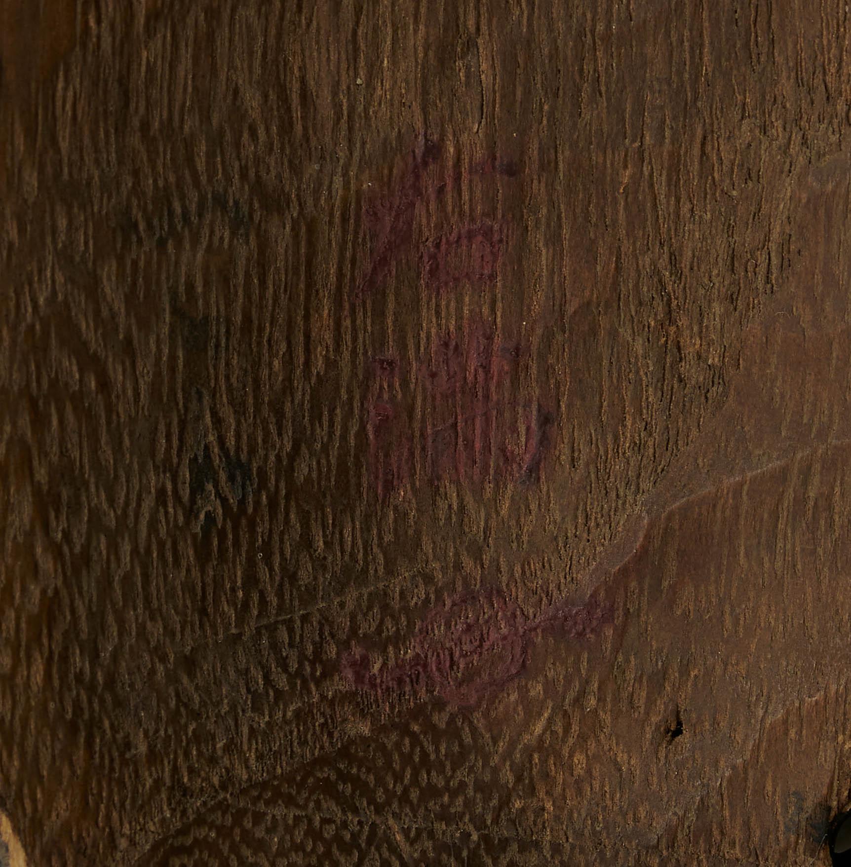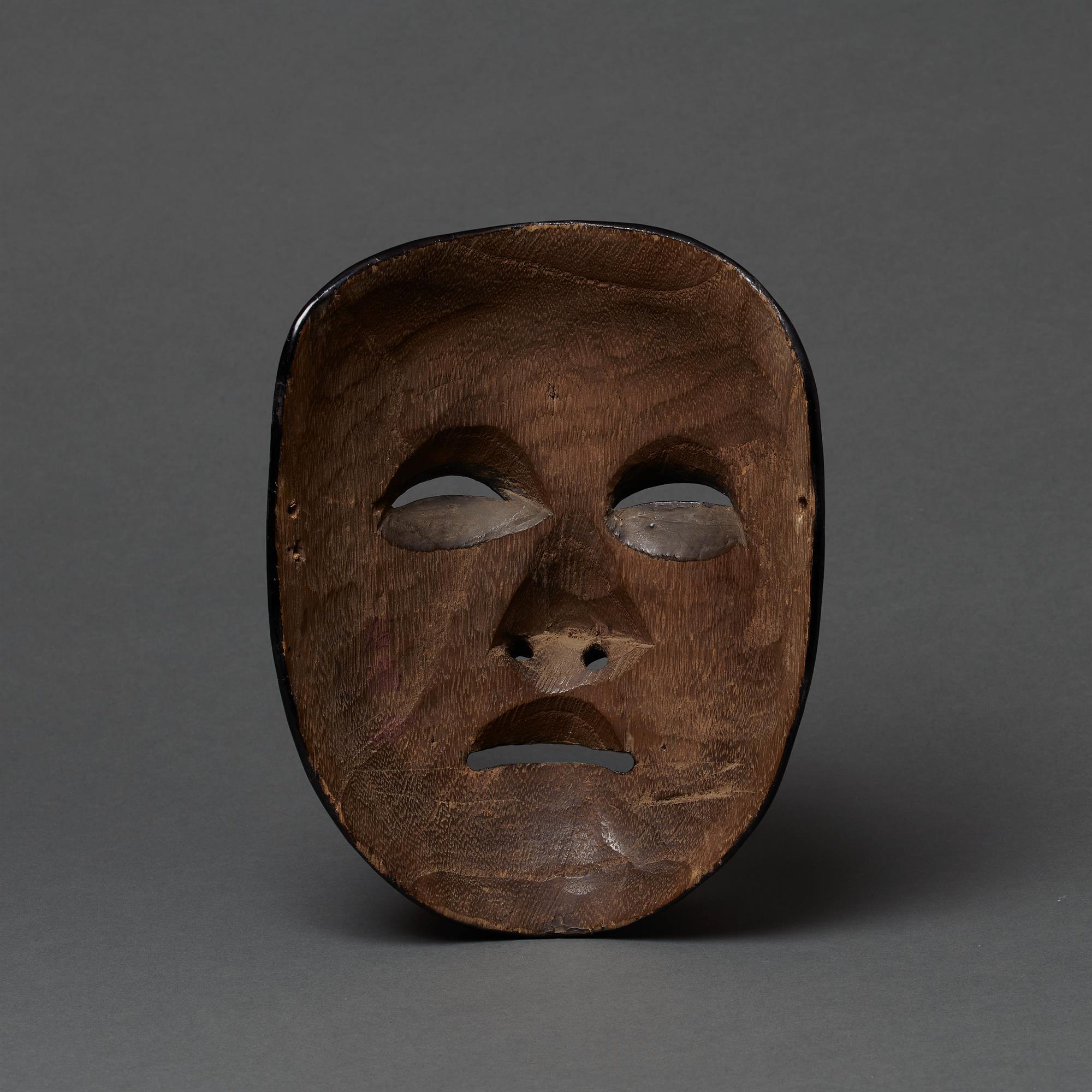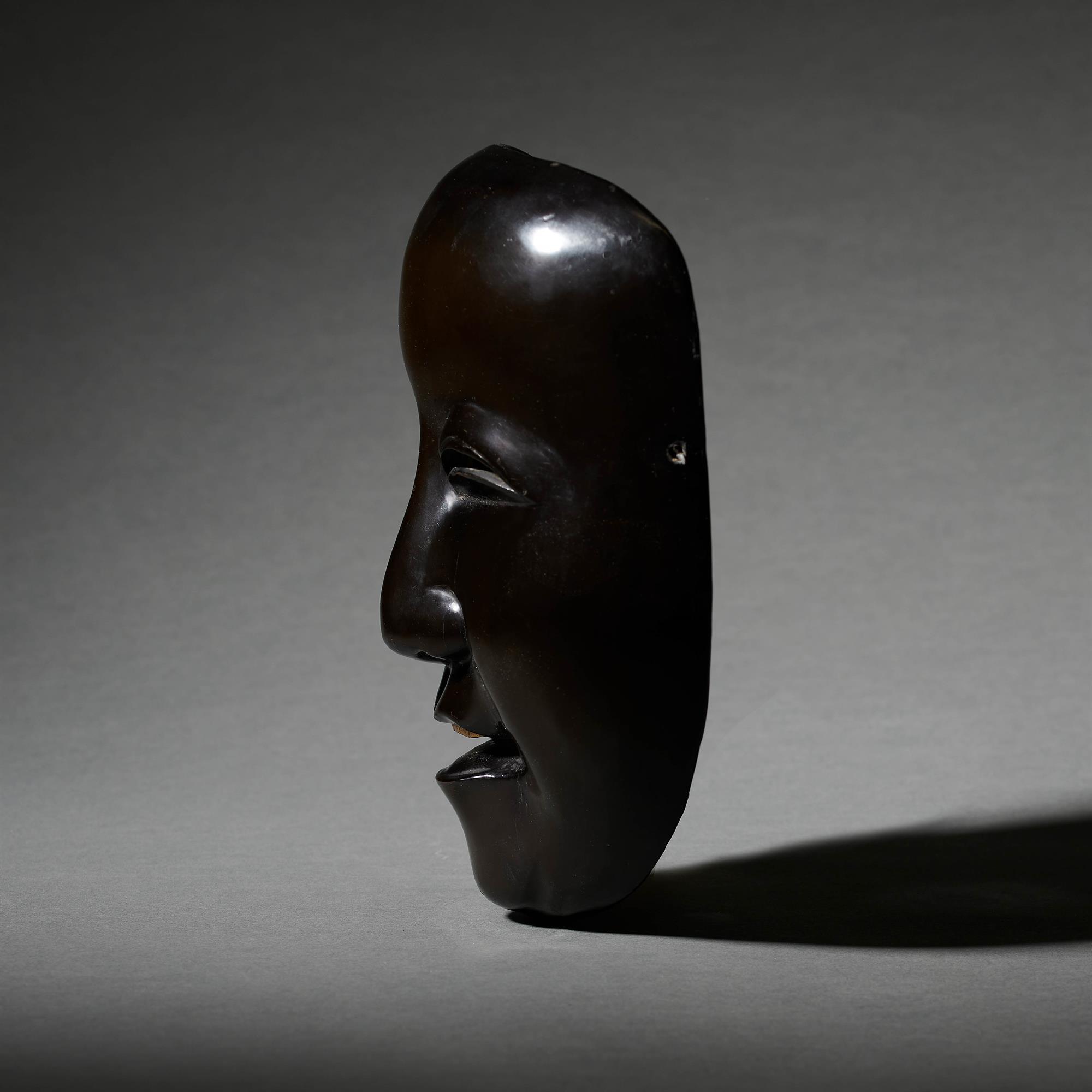A carved wood Noh mask. The face with a high black lacquer finish and gilded teeth. Signed in red lacquer on the interior Uman with Kakihan. Deme Uman is a well-known Noh mask carver’s name, but there are thought to be more than one artist in the school who use the same name.