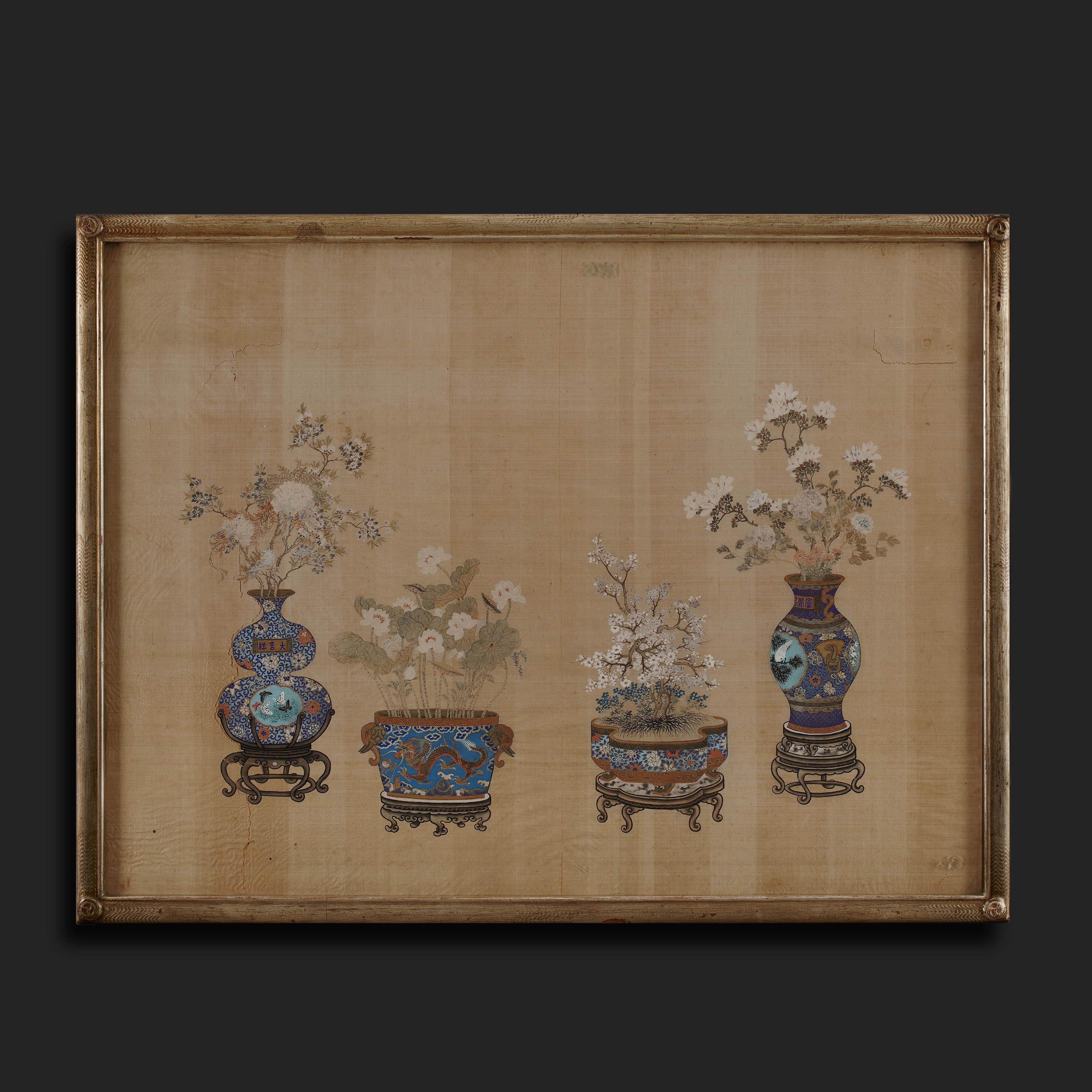 A silk ground painting depicting four exotic Imperial flower vessels, exquisitely painted in watercolour and gilt. The court vases imitating 18th Century cloisonné and porcelain, each displaying lotus and delicate flowering branches.