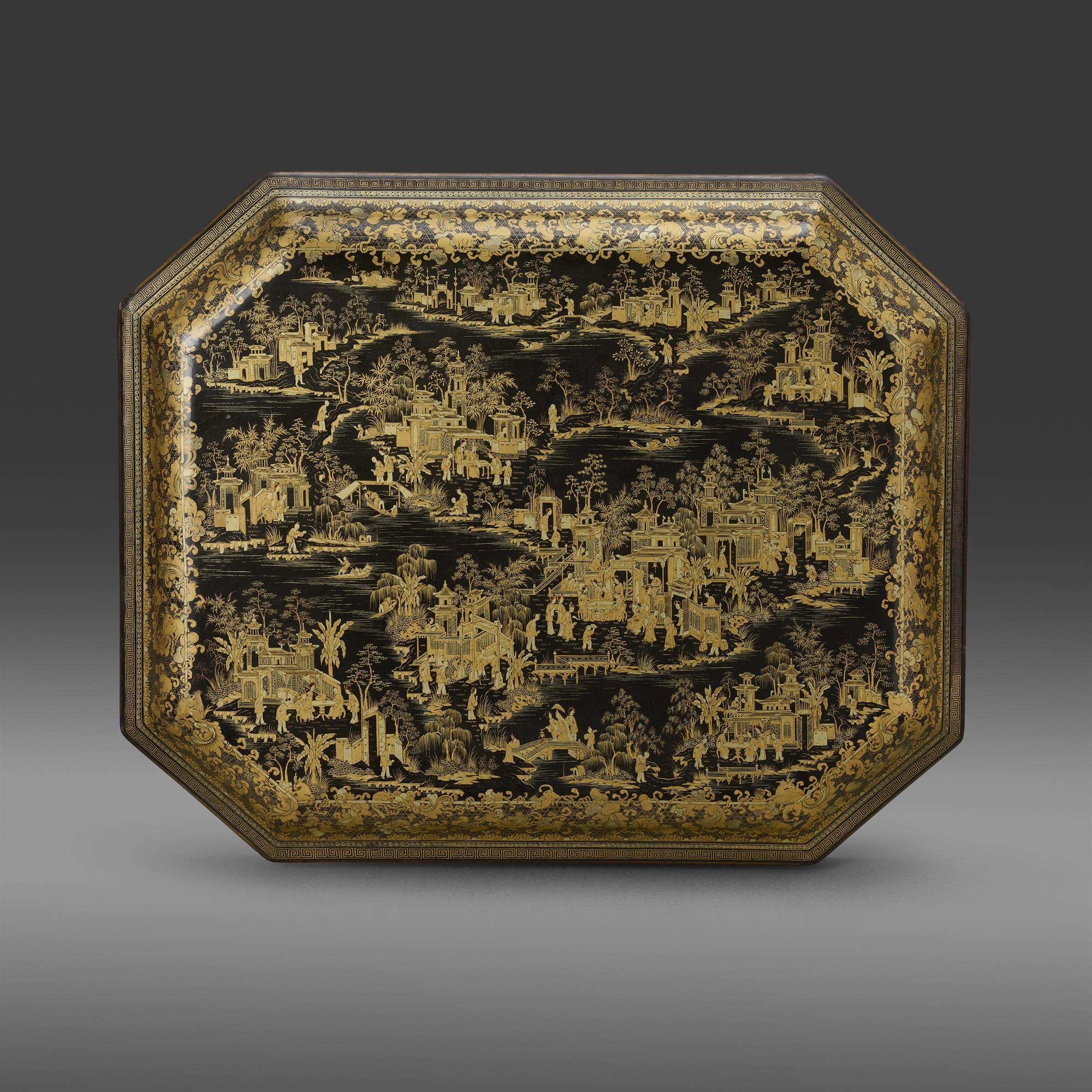 A highly impressive Canton export gaming box. Decorated overall in gilt lacquer in different shades of gold, depicting exotic summer palaces within a large lake setting. The scenes shown in an intricately and unusual small scale, with exquisite detail.