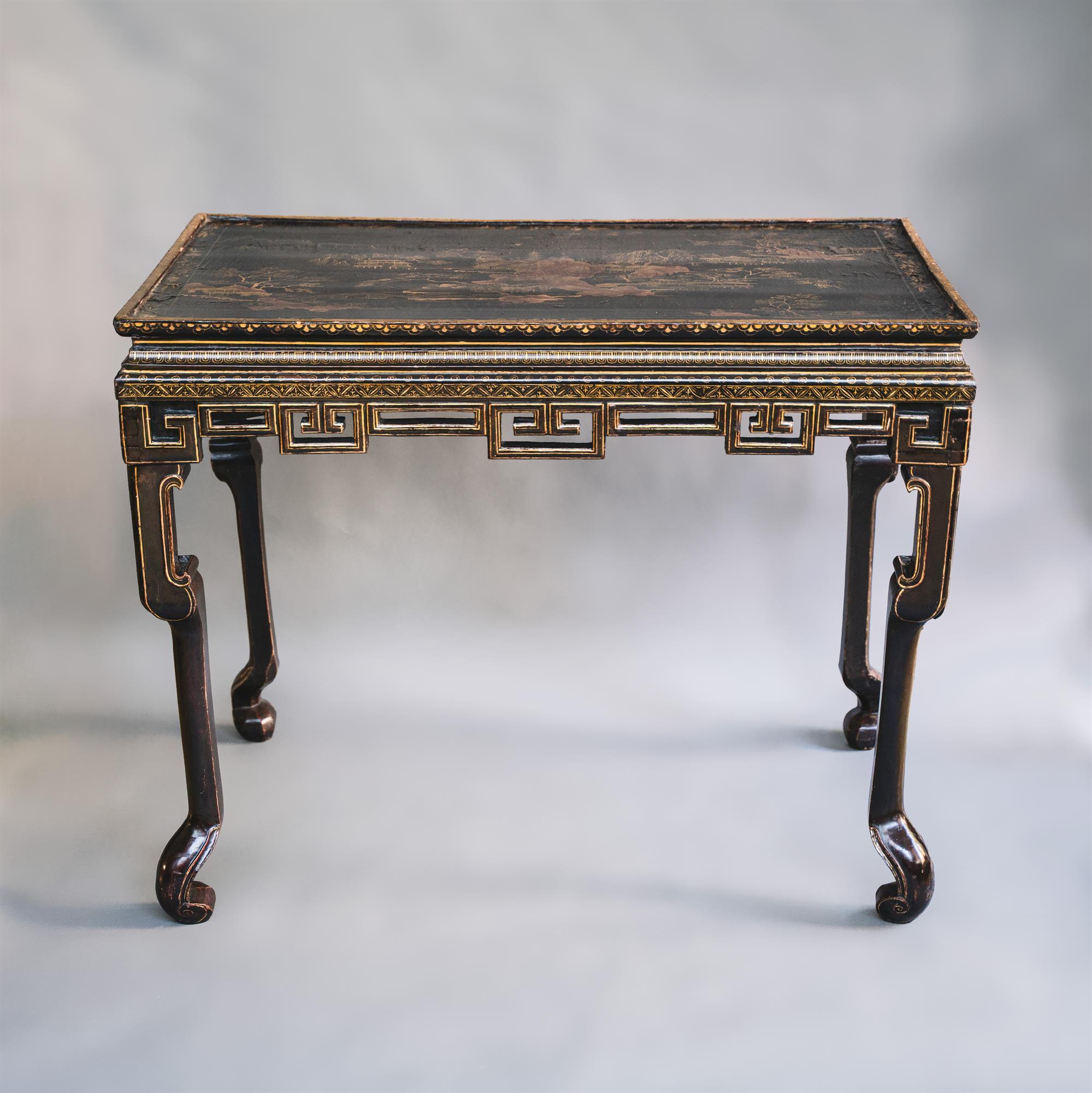 A very good example of an English style side table made in Canton for export to England. The top is decorated in gold lacquer on a black ground with exotic pavilions upon a rocky island. The fretwork and legs with further gilt lacquer decoration. (All lacquer in remarkable condition.)