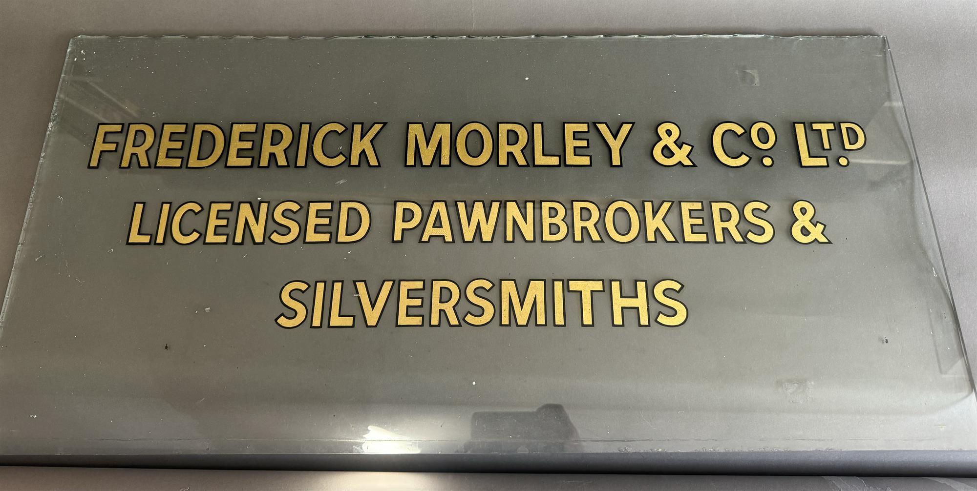 A rare pawnbroker’s trade glass shop sign, plus the three large copper balls retaining their original gilt finish. The group originally suspended above Frederick Morley & Co Limited Pawnbrokers, located on 55-57 Fitzroy Street, Cambridge. Sign and copper ball accompanied by original photographs of the site, and a sale catalogue of Unredeemed Pledges, 1961.